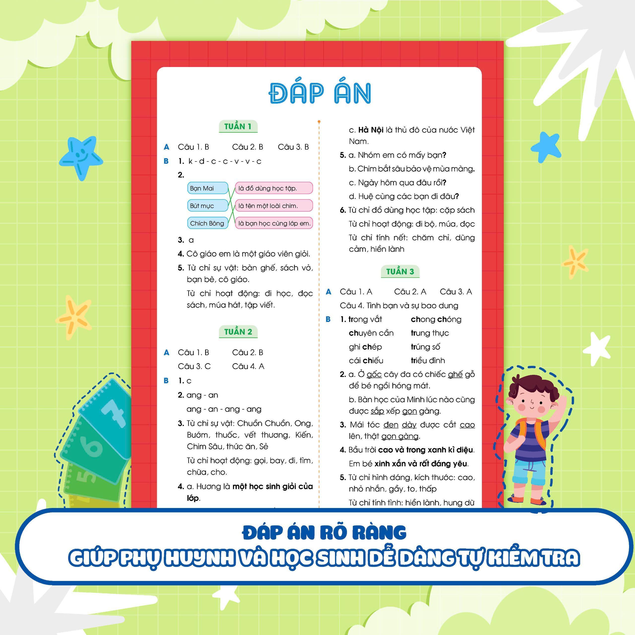 Đặc biệt, sau mỗi kì sẽ có bài ôn tập giữa kì và cuối kì giúp con có tài liệu ôn tập cho các kì kiểm tra. Ngoài ra, phần đáp án phía sau giúp bố mẹ đánh giá năng lực, từ đó có phương pháp ôn luyện phù hợp cho con.