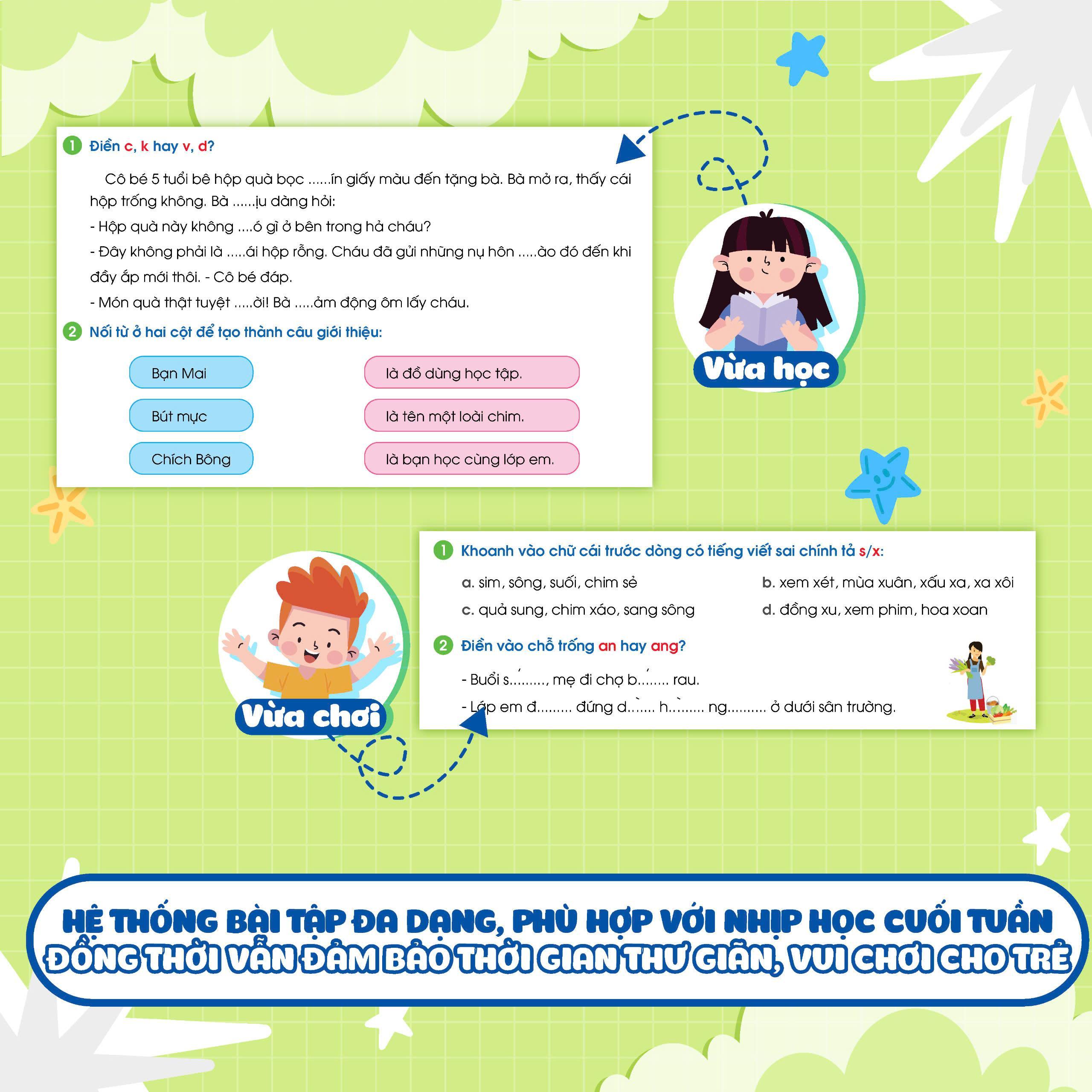 Hệ thống bài tập đa dạng, lượng phù hợp với việc học cuối tuần để các con vẫn có thời gian thư giãn và vui chơi.