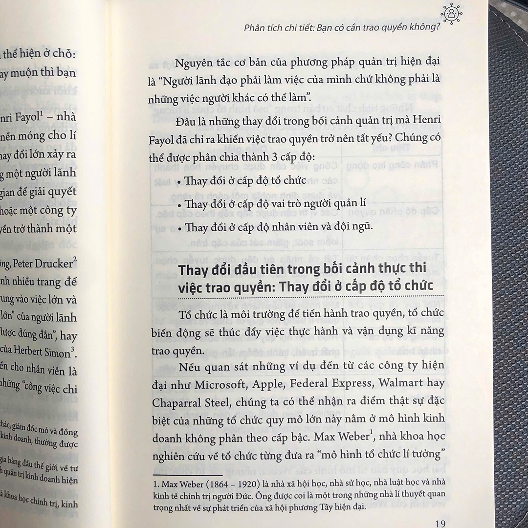Cuốn sách này tập trung vào hai điểm chính: Thứ nhất là quy trình triển khai việc trao quyền. Phần này cung cấp nhiều kĩ năng quản lí trao quyền mang tính thực tiễn, giúp nó thực sự trở thành một giáo trình quản lí "vừa học vừa áp dụng được ngay”. Thứ hai là sự kết hợp giữa "kĩ thuật và nghệ thuật" trao quyền. Phần này tóm tắt các tình huống quản lí và những khó khăn khi quản lí, cố gắng đem lại cho các nhà quản lí những gợi mở rõ ràng hơn, bởi việc trao quyền là một nét độc đáo trong lĩnh vực quản lí, chứa đựng cả tính khoa học và nghệ thuật.
