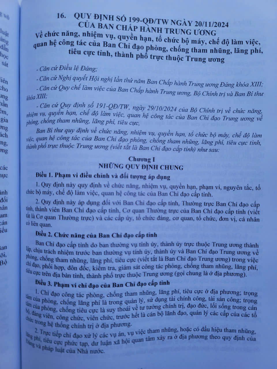 Thời gian qua, nhiều quy định, hướng dẫn của Ban Bí thư, Bộ Chính trị, Ban Chấp hành Trung ương cũng đã được ban hành như: Quy định số 231-QĐ/TW ngày 17/01/2025 Về bảo vệ người đấu tranh chống tham nhũng, lãng phí, tiêu cực, Quy định số 262-QĐ/TW ngày 03/02/2025 Về sửa đổi, bổ sung một số Điều của Quy định số 22-QĐ/TW, ngày 28/7/2021 của Ban Chấp hành Trung ương Đảng về công tác kiểm tra, giám sát và kỷ luật của Đảng…