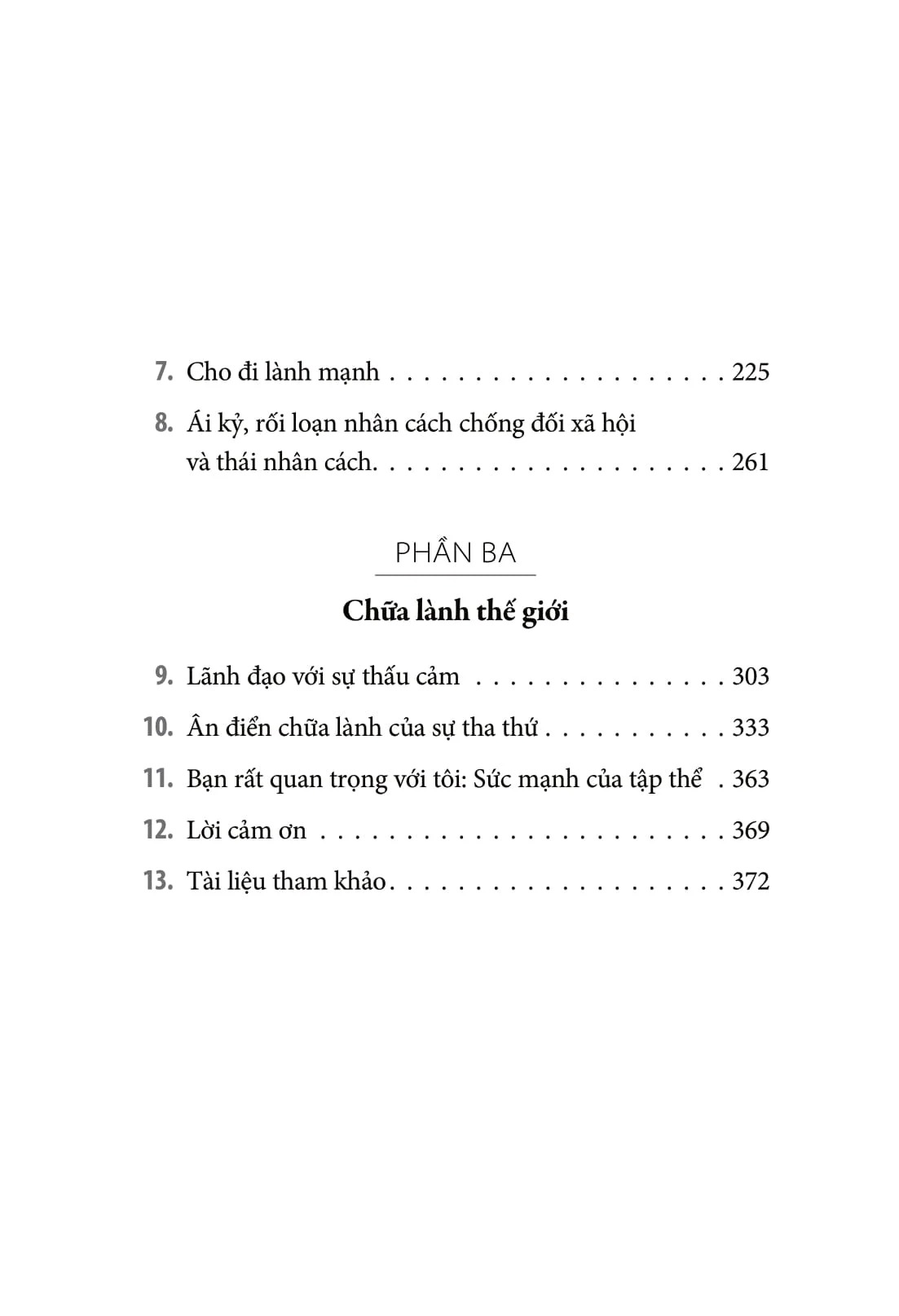 Cuốn sách mở ra một hành trình ba bước: thấu cảm với chính mình, với người khác và với thế giới – với nhiều chiến lược cụ thể, bài tập thực hành và chia sẻ cá nhân chân thật.