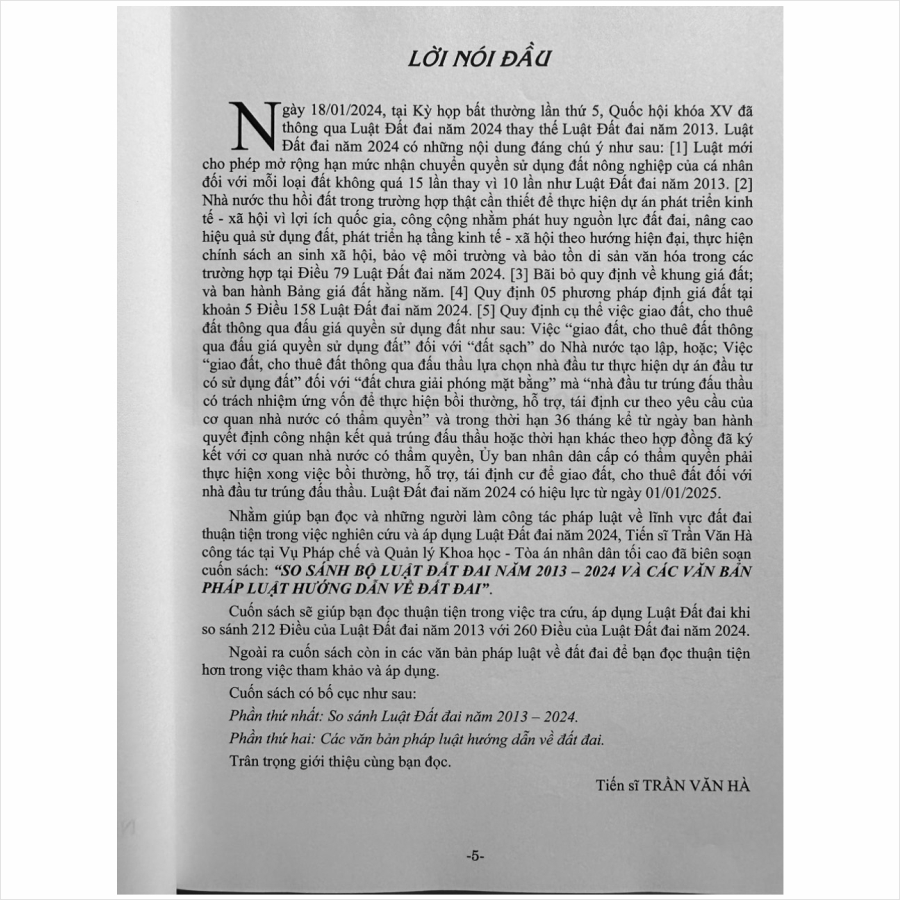 Nhằm giúp bạn đọc và những người làm công tác pháp luật về lĩnh vực đất đai thuận tiện trong việc nghiên cứu và áp dụng Luật Đất đai năm 2024, Tiến sĩ Trần Văn Hà công tác tại Vụ Pháp chế và Quản lý Khoa học – Tòa án nhân dân tối cao đã biên soạn cuốn sách: “So Sánh Bộ Luật Đất Đai Năm 2013 – 2024 Và Các Văn Bản Pháp Luật Hướng Dẫn Về Đất Đai”.