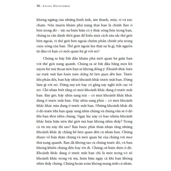 Bằng cách hướng dẫn bạn quan sát và thấy ra Bản ngã sáng suốt – bản thể chân thật của mình, thấy ra nguyên lý vận hành của tâm trí, trái tim và năng lượng nội tại trước những sự kiện xảy ra ở thế giới bên ngoài, Michael Singer chỉ dẫn bạn làm thế nào để giải phóng mọi mô thức tích tụ bên trong để trở về trạng thái tự do tuyệt vời vốn có của nội tâm và tận hưởng từng khoảnh khắc của đời sống diễn ra trước mắt bạn.