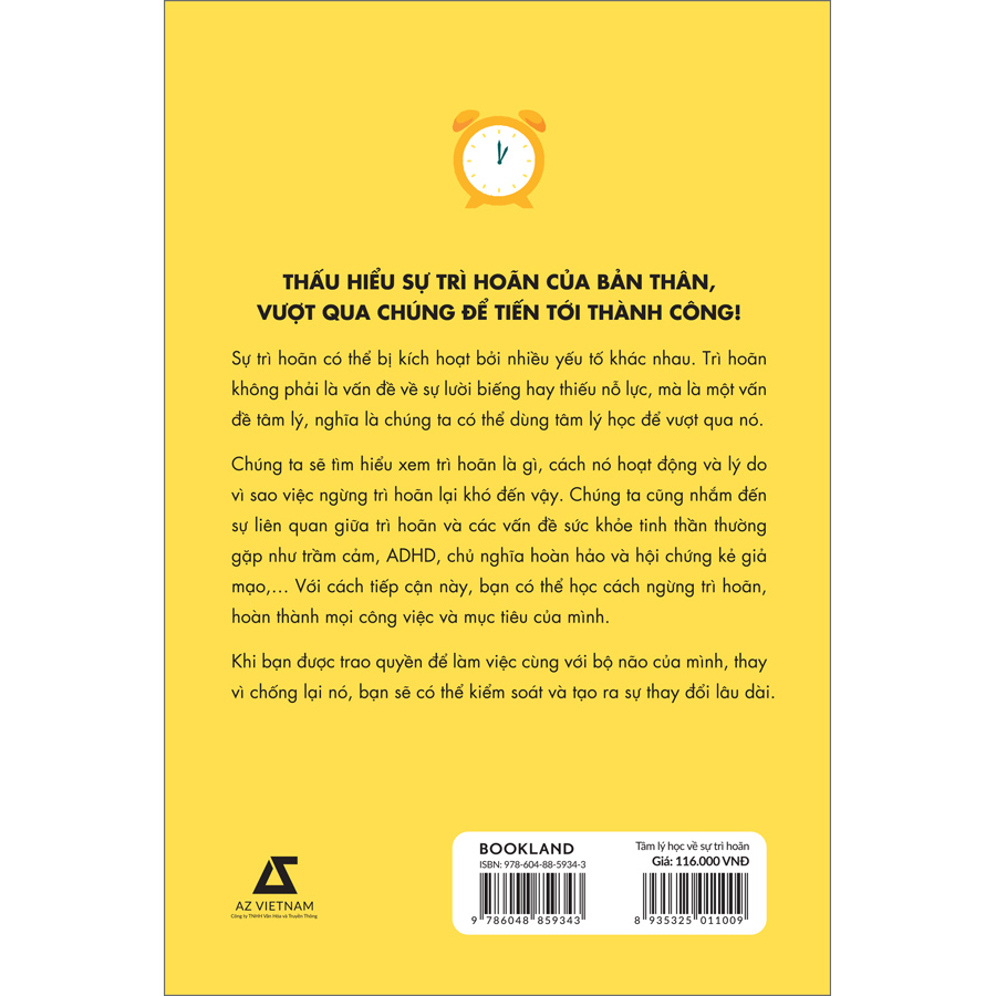 Trong cuốn sách này, chúng ta sẽ cùng tìm hiểu xem trì hoãn là gì, cách nó hoạt động và lý do vì sao việc ngừng trì hoãn lại khó đến vậy. Chúng ta cũng nhắm đến sự liên quan giữa trì hoãn và các vấn đề sức khỏe tinh thần thường gặp như trầm cảm, ADHD, chủ nghĩa hoàn hảo và hội chứng kẻ giả mạo,… Với cách tiếp cận này, bạn có thể học cách ngừng trì hoãn, hoàn thành mọi công việc và mục tiêu của mình.