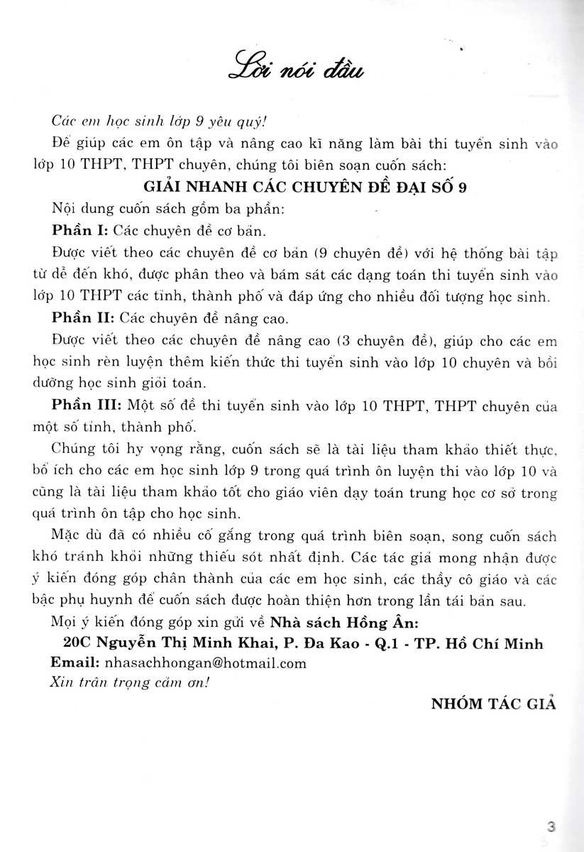 Phần I: Các chuyên đề cơ bản Được viết theo các chuyên đề cơ bản (9 chuyên đề) với hệ thống bài tập từ dễ đến khó, được phân loại và bám sát các dạng toán thi tuyển sinh vào lớp 10 THPT các tỉnh, thành phố và đáp ứng cho nhiều đối tượng học sinh.
