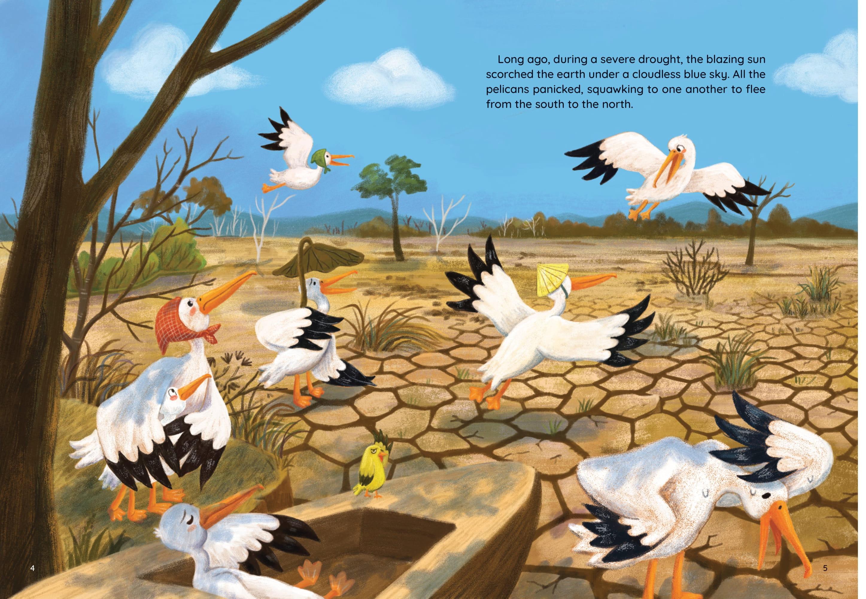 long ago, during a drought, a flock of pelicans flew together from the south to the north. among them, there were a mother pelican and her little one. they always stayed close during this long and dangerous journey. but when the mother got hurt, what could her child do?