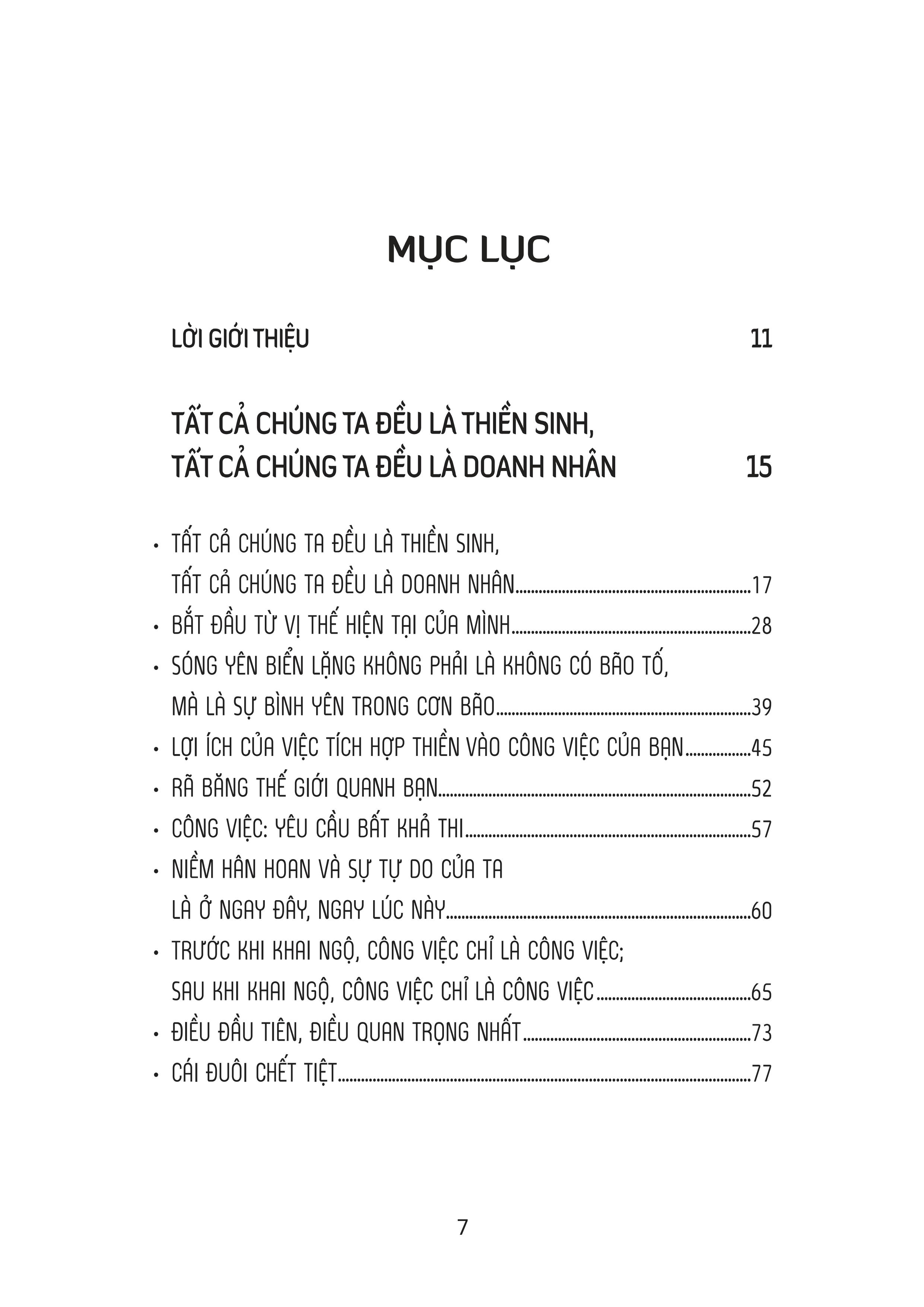 Thiền định và Kinh doanh là hai khái niệm tưởng chừng hoàn toàn khác biệt. Nhưng dưới con mắt của Marc Lesser - một doanh nhân tự tay gây dựng doanh nghiệp của mình, và cũng là một thiền sư đã hành Thiền trong hơn 30 năm - thì mối liên kết giữa hai khái niệm này lại vô cùng chặt chẽ, và “tất cả chúng ta đều là thiền sinh, tất cả chúng ta đều là doanh nhân”.