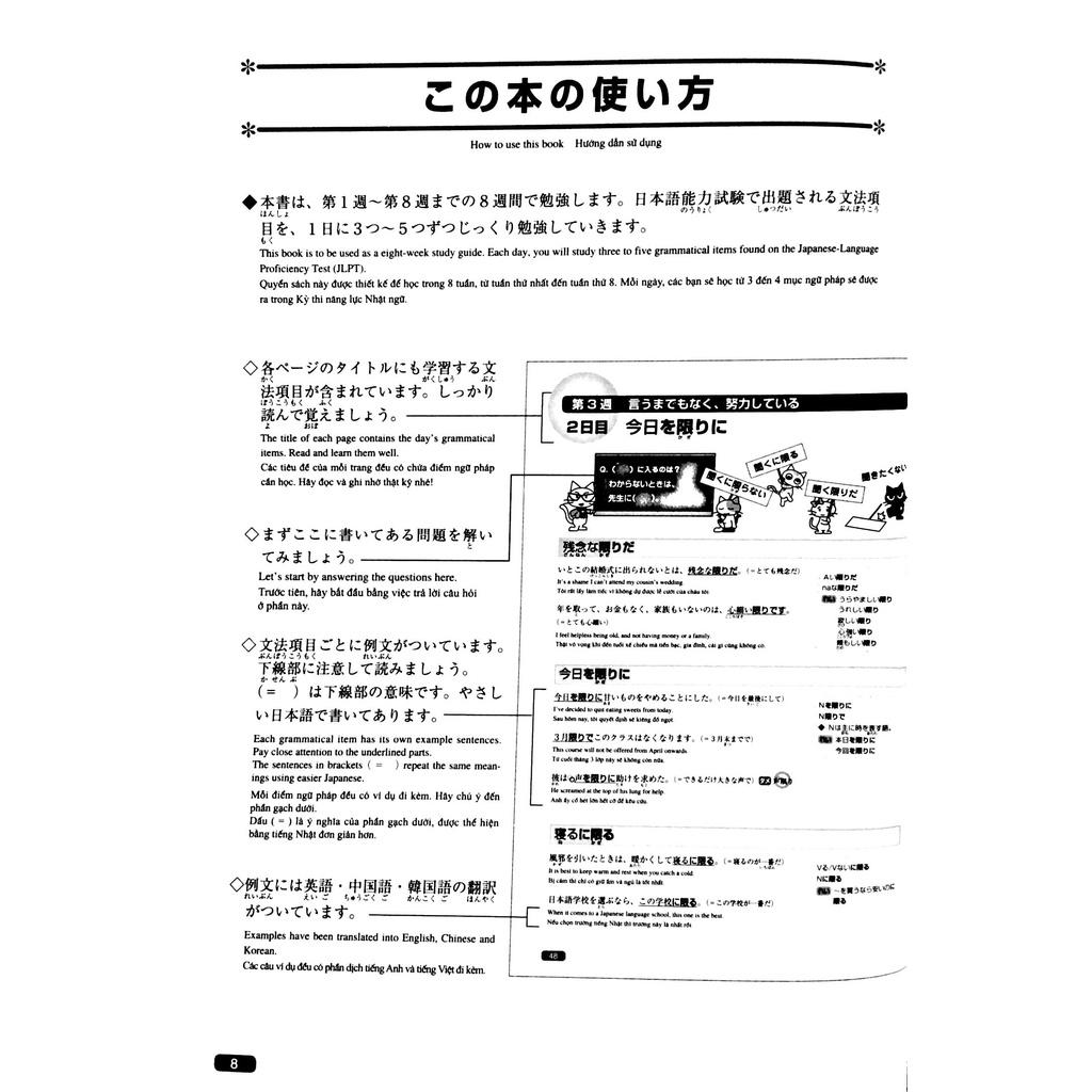 Mua tại TiktokGIỚI THIỆU SÁCH Luyện Thi Năng Lực Nhật Ngữ N1 - Ngữ Pháp Luyện thi Năng lực Nhật ngữ N1 gồm 5 quyển: Hán tự (Kanji), Từ vựng (Goi), Đọc hiểu (Dokkai), Nghe hiểu (Choukai) và Ngữ pháp (Bunpou). Đây là một tựa sách học tiếng Nhật hàng đầu trong hệ thống phân phối sách Kinokuniya lớn nhất Nhật Bản. Bộ sách này giúp những bạn chuẩn bị tham gia Kỳ thi năng lực Nhật ngữ JLPT nắm được những nội dung kiến thức cần phải có trong năng lực Nhật ngữ - trình độ N1 một cách nhanh chóng, hiệu quả và tổng quát nhất trong khoảng thời gian từ 4 đến 6 tuần.