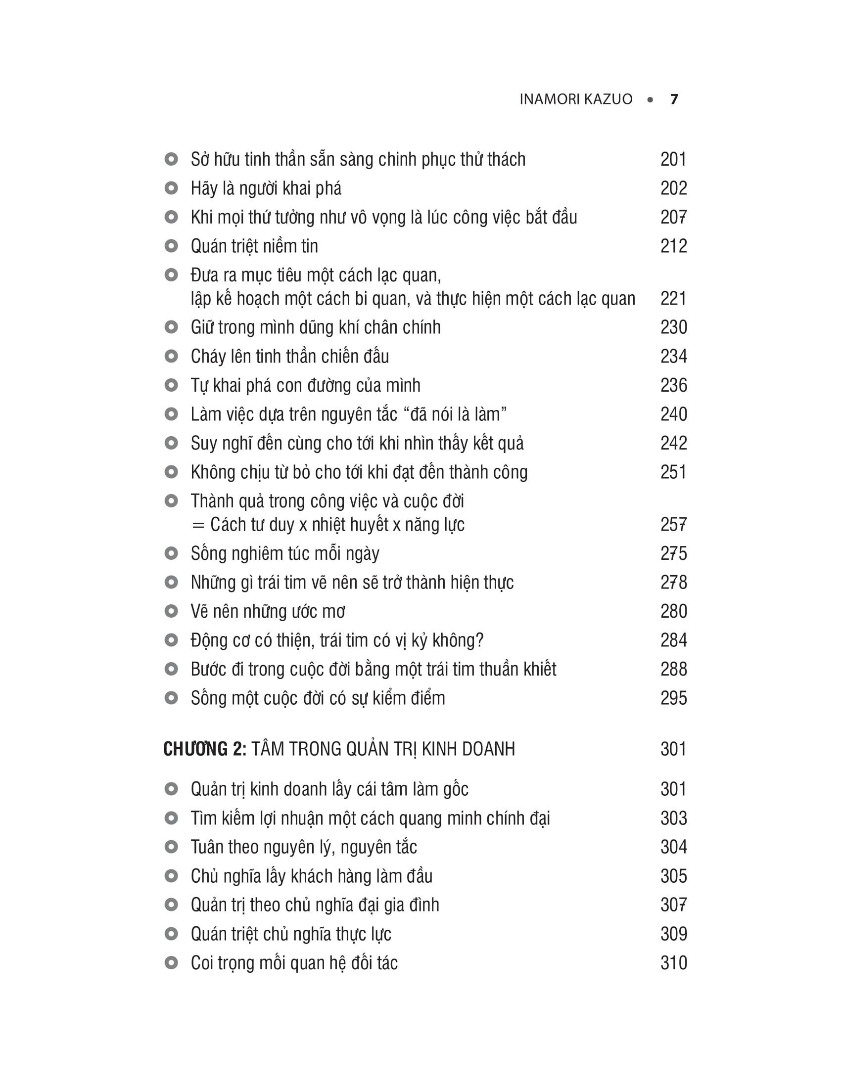 Trong cuốn sách, Inamori Kazuo đã chỉ ra tầm quan trọng của tâm thế hay cách tư duy qua công thức sau: Thành quả trong cuộc đời và công việc = Cách tư duy x Nhiệt huyết x Năng lực. Dù một người có năng lực cao hay nhiệt huyết bỏng cháy đến đâu, nhưng nếu có tâm thế tiêu cực thì vẫn phải gánh chịu thất bại. Mọi sự đều xuất phát từ cái tâm. Doanh nhân nào có cái tâm hướng thiện sẽ đạt được nhiều thành công trong sự nghiệp. Inamori Kazuo đã nhiều lần nhấn mạnh điều này trong cuốn sách. Ông còn khuyên các doanh nhân phải có lòng vị tha, biết ơn, luôn tin vào khả năng không giới hạn của bản thân và hướng tới sự hoàn hảo. Bạn đọc cũng có thể tìm thấy trong Chương 1 của cuốn sách rất nhiều lời khuyên vô giá của một trong những doanh nhân ưu tú nhất trên thế giới.