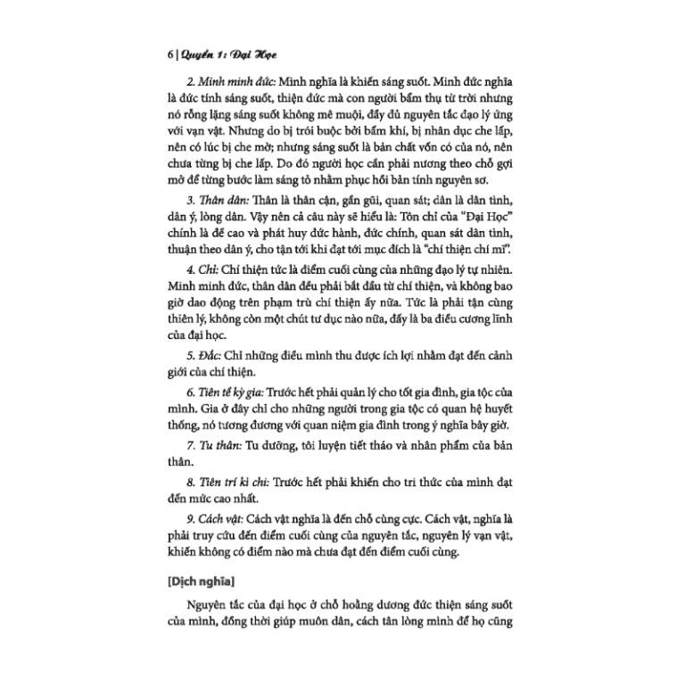 - Phần dịch nghĩa: Diễn giải ý nghĩa của phần Nguyên văn. Bộ sách Tứ Thư này có khác về cách trình bày so với một số sách Tử Thư đã có trên thị trường. Bộ sách này đã chia rõ các phần Nguyên văn, Phiên âm, Chú thích và Dịch nghĩa để độc giả tiện tìm hiểu và tra cứu.