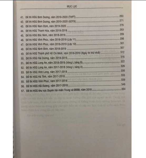 Mua tại TiktokNội dung gồm có: Phần I: Tuyển chọn đề thi chọn đội dự tuyển thi học sinh giỏi quốc gia Phần II: Tuyển chọn đề thi chọn học sinh giỏi cấp tỉnh, thành phố Tất cả các đề đều có đáp án và thang điểm chi tiết Đây sẽ là tài liệu hữu ích cho các em học sinh và các thầy cố giáo trong quá trình ôn luyện, bồi dưỡng học sinh giỏi. Chi tiết sản phẩm Tác giả: Kim Hà Sô trang: 359 Xuất bản: 2022 Nhà xuất bản: Đại học quốc gia Hà Nội Công ty phát hành: NXB Đại Học Quốc Gia Hà Nội