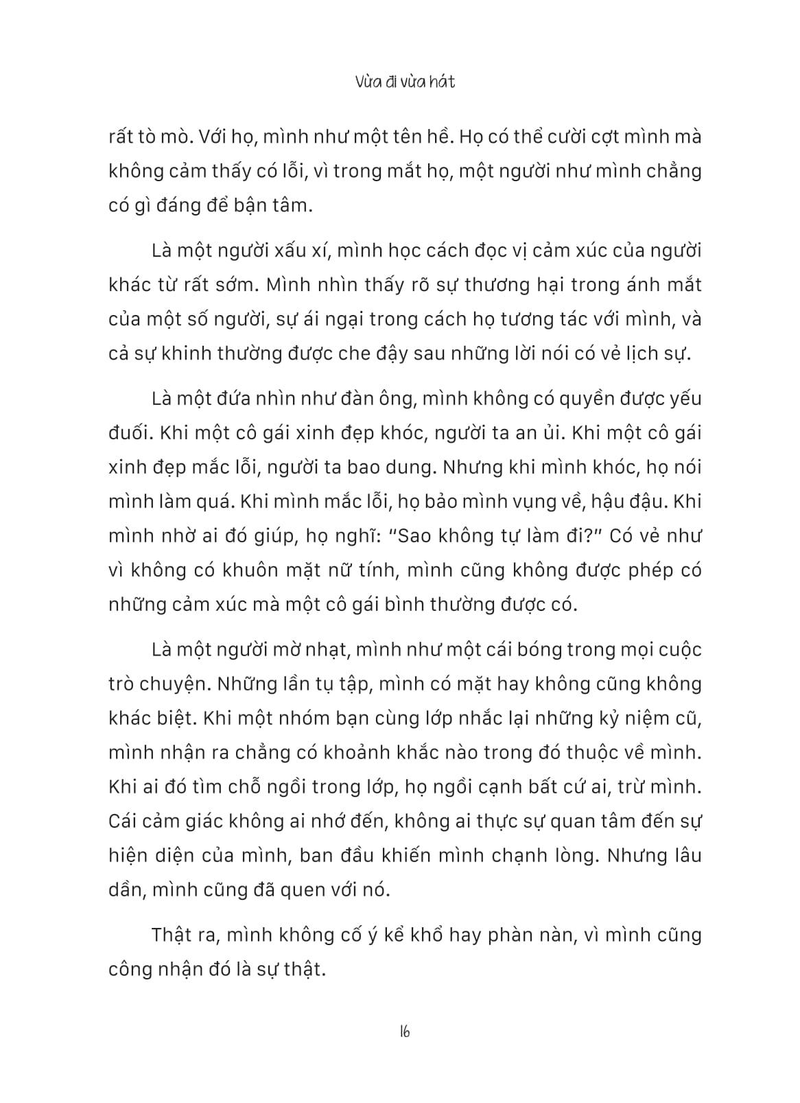 Hãy để cuốn sách nhắc bạn nhớ: Bạn không cần phải gồng lên để đối chọi thế giới ngoài kia một m.ình. Hãy cứ chật vật và là-chính-m.ình. Sẽ luôn có một người đi song song với bạn, không hề thúc giục, hối ép, chỉ “vừa đi vừa hát”.