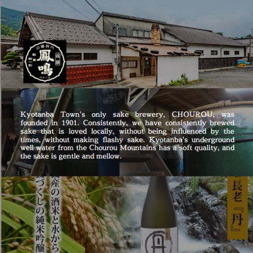 Với hương vị mịn, nhẹ. Rượu sake `` Chourou Tan '' được làm hoàn toàn từ gạo, nước, nhà máy rượu sake và nhà sản xuất bia của Kyotanba, đồng thời được làm bằng gạo sake Gohyakumangoku được sản xuất ở Kyotanba và nước từ Kyotanba. Đây thực sự là loại rượu sake do Kyotanba sản xuất, được ủ cẩn thận bằng tất cả đam mê bởi nhà sản xuất rượu sake trẻ tuổi của nhà máy rượu sake duy nhất của Kyotanba Chourou Shuzou.