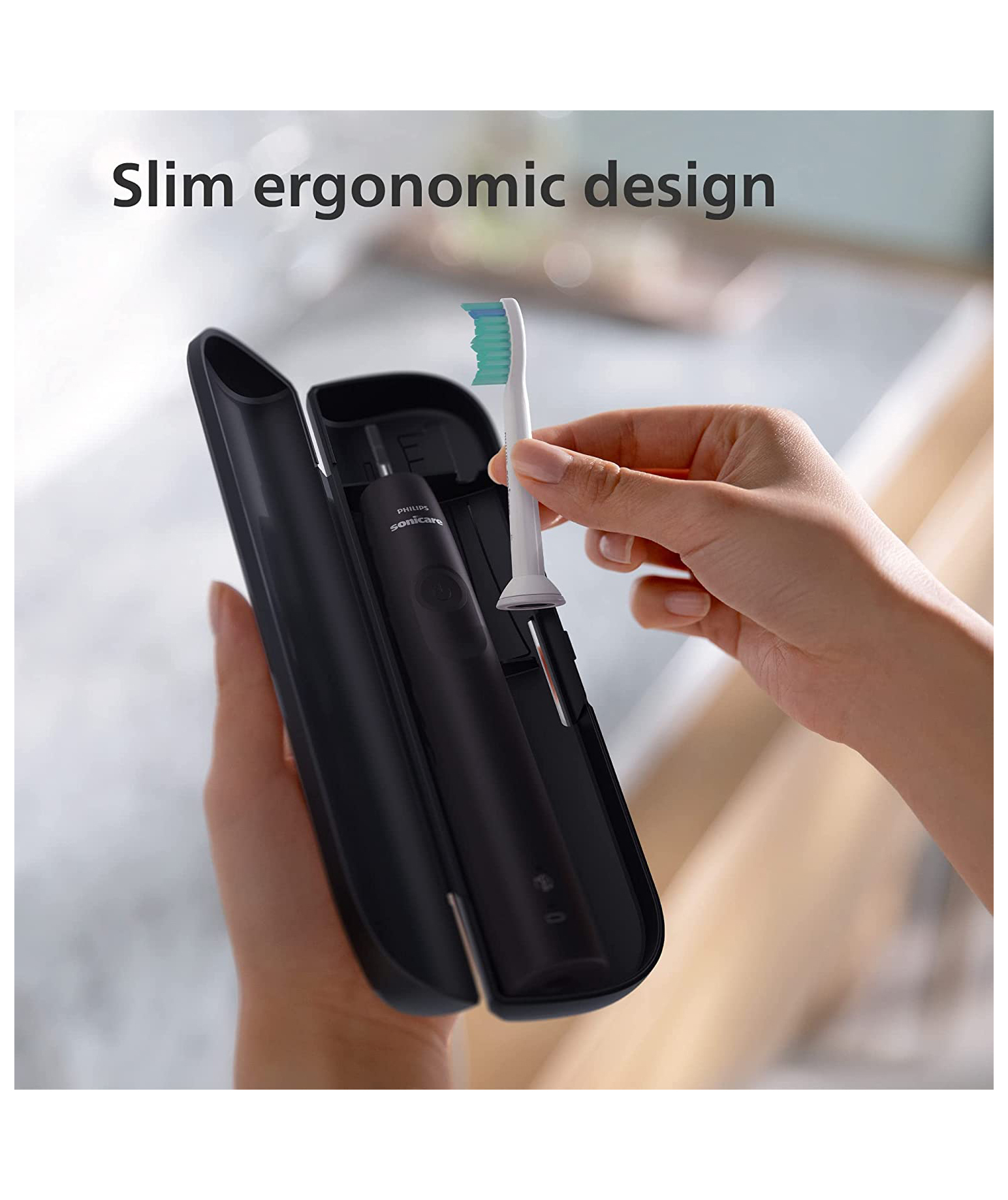 Bàn chải điện Philips Sonicare 1100 Thiết kế tay cầm thuận theo tư thế tự nhiên của người dùng giúp dễ cầm và sử dụng bàn chải Công nghệ điện sóng âm (Sonic) kết hợp