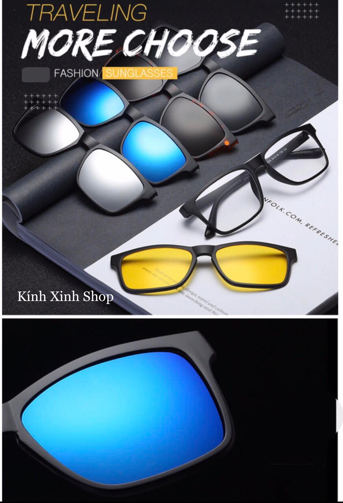 Kính CÂN - RÂM 6in1 tròng Phân Cực chống lóa (5 tròng râm) · Gọng kính được làm bằng chất liệu nhựa dầy, mặt sau có 2 nam châm giúp giữ được tròng mát khi