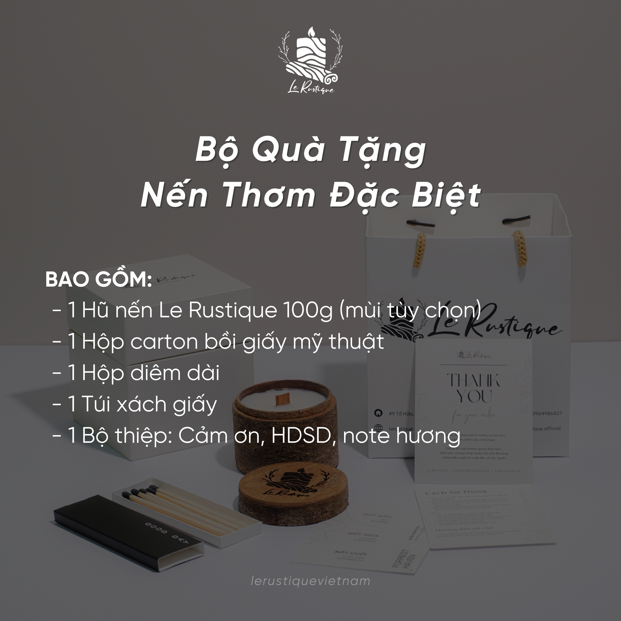 1 Bộ thiệp: Cảm ơn, HDSD, note hương Những hũ nến thơm thiên nhiên giúp thư giãn, trị liệu hiệu quả đi kèm với một Set Quà Tặng tinh gọn, chỉn chu tạo nên một món quà ý nghĩa và vẹn đầy cho những người bạn/ người đồng nghiệp/ người thân yêu. Hy vọng "món quà đặc biệt" mà Le Rustique mang đến sẽ giúp những người thân yêu hay chính bạn có những phút giây thư giãn tuyệt vời cùng trải nghiệm đẹp nhất! ️ CAM KẾT: Le Rustique cam kết sản phẩm đúng như hình và mô tả. ➢ Trường hợp nhận hàng mà không đúng mô tả, sai số lượng, nhầm hàng hoặc hàng bể vỡ trong quá trình vận chuyển... Nhắn tin ngay cho shop TRONG VÒNG 24H sau khi nhận hàng để được giải quyết và hỗ trợ nhé. ➢ Khi nhận hàng, vui lòng quay VIDEO MỞ HÀNG để bảo đảm quyền lợi nếu có sai sót và hỗ trợ giải quyết vấn đề cho bạn nhanh nhất có thể.