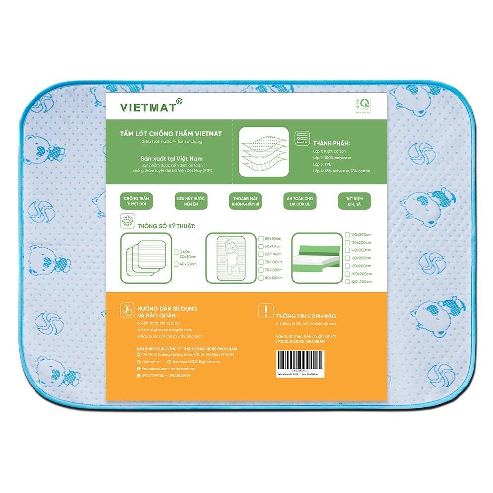 - Chất liệu của Tấm lót chống thấm cho bé Vietmat: có cấu trúc 4 lớp: Lớp bề mặt chất liệu 100% cotton thiên nhiên, giúp tấm lót mát, không hầm bí khi nằm. Lớp 2 là bông thấm nước, có tác dụng hấp thụ nước tiểu, mồ hôi của bé. Lớp 4 là vải chống trượt, vừa có tác dụng bảo vệ lớp chống thấm để tấm lót sử dụng được bền lâu.