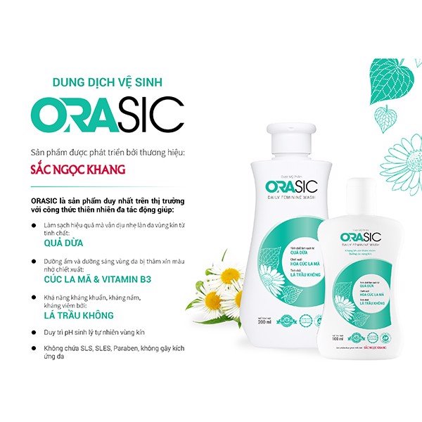 DUNG DỊCH VỆ SINH PHỤ NỮ ORASIC Kháng khuẩn thiên nhiên, dưỡng da - Thành phần của Orasic: - Dung dịch vệ sinh phụ nữ Orasic gồm nhiều thành phần: vitamin B3, vitamin B5 nhưng