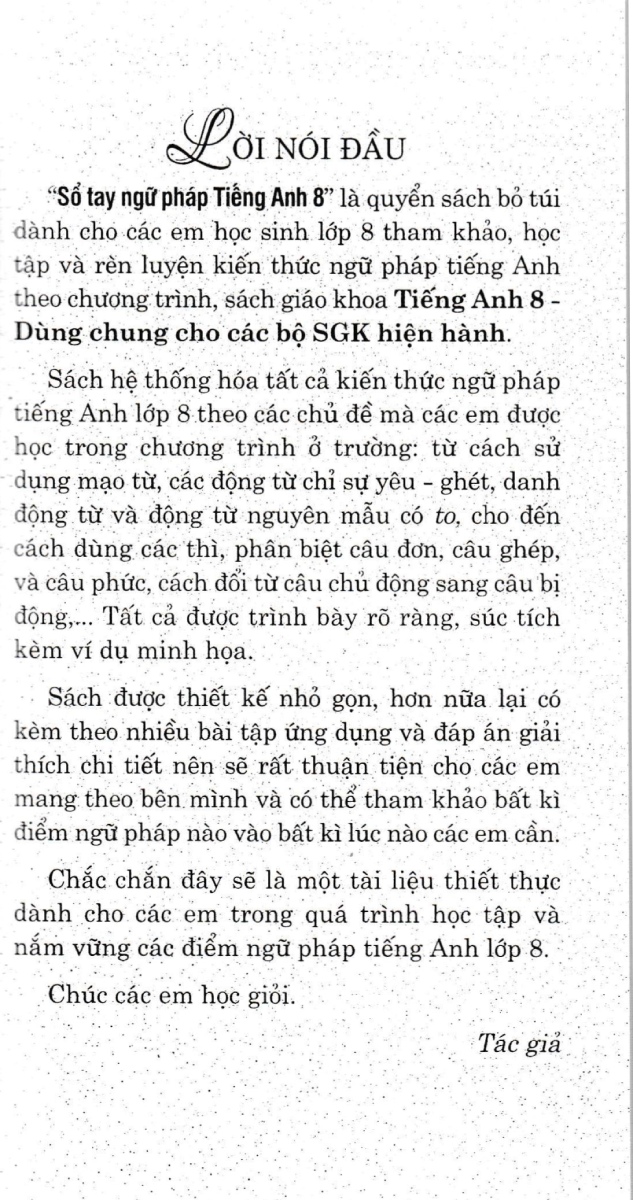 Chắc chắn đây sẽ là một tài liệu thiết thực dành cho các em trong quá trình học tập và nắm vững các điểm ngữ pháp tiếng Anh lớp 8.