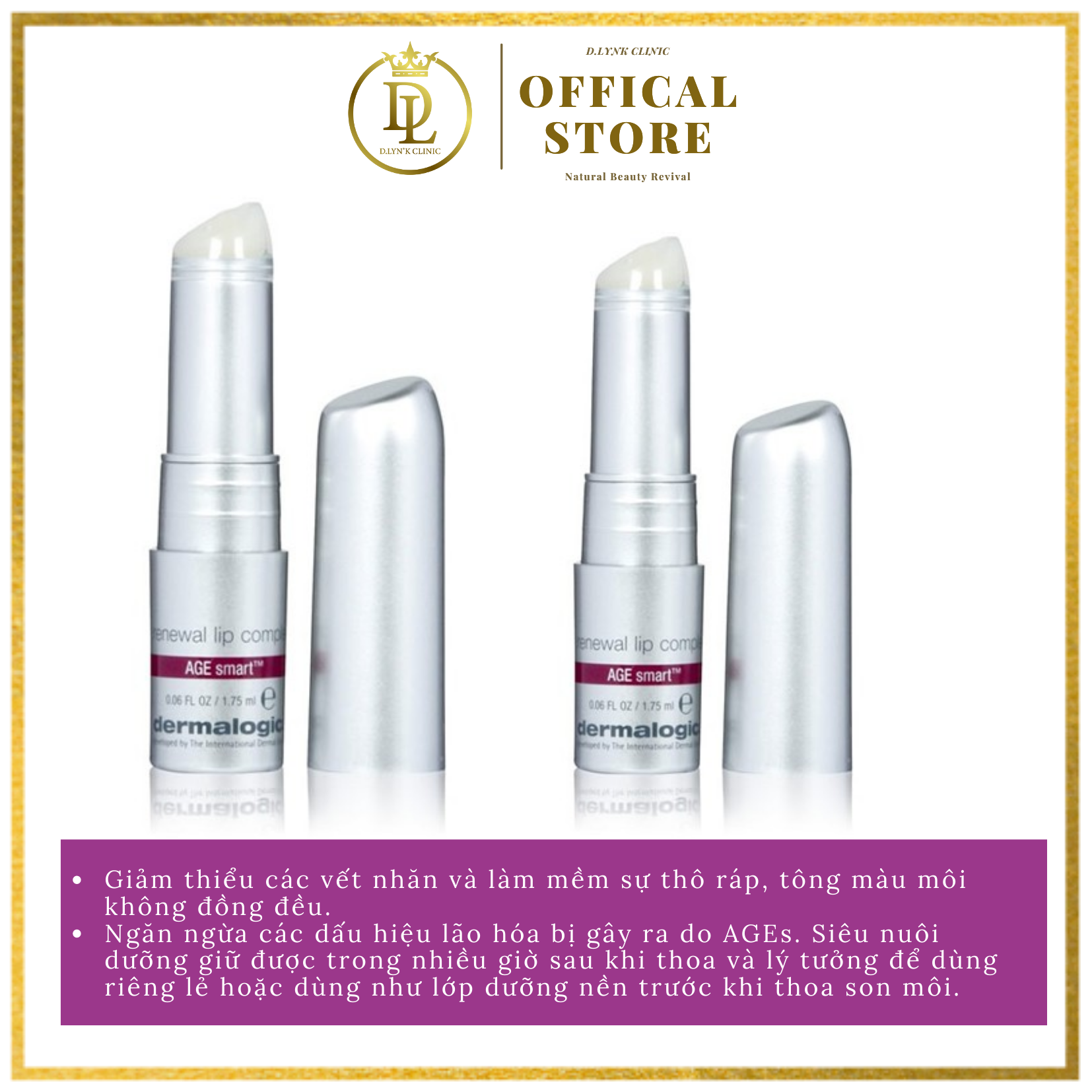 ● Công dụng: Giảm thiểu các vết nhăn và làm mềm sự thô ráp, tông màu môi không đồng đều. Ngăn ngừa các dấu hiệu lão hóa bị gây ra do AGEs. Siêu nuôi dưỡng giữ được trong nhiều giờ sau khi thoa và lý tưởng để dùng riêng lẻ hoặc dùng như lớp dưỡng nền trước khi thoa son môi.