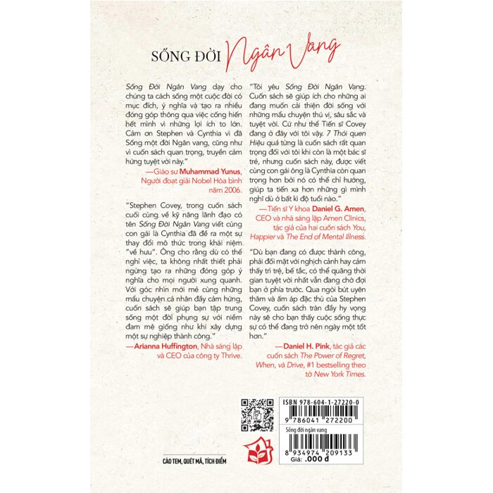 Sống Đời Ngân Vang Quyển sách Live Life in Crescendo được viết bởi Stephen R. Covey và Cynthia Covey, là một tác phẩm mang thông điệp mạnh mẽ về việc sống một cuộc sống đầy ý nghĩa và phát triển không ngừng. Đây là một cuốn sách khuyến khích người đọc tạo ra một ảnh hưởng tích cực trong cuộc sống, thông qua việc sống theo các giá trị bền vững, phát triển cá nhân và đóng góp cho cộng đồng. Cuốn sách gợi nhắc rằng mỗi chúng ta đều có câu chuyện riêng, đều phải trãi qua những nỗi đau và những biến cố trong đời, nhưng ai cũng có sức mạnh nội tại để đứng dậy và bước tiếp. Chúng ta không chỉ vượt qua những điều tưởng chừng như không thể, mà còn tiếp tục sống để tìm lại niềm hạnh phúc trong đời. Dù bạn đang có được thành công hay đối mặt với nghịch cảnh, cảm thấy trì trệ, bế tắc... có thể quãng thời gian tuyệt vời nhất vẫn đang chờ đợi bạn ở phía trước.