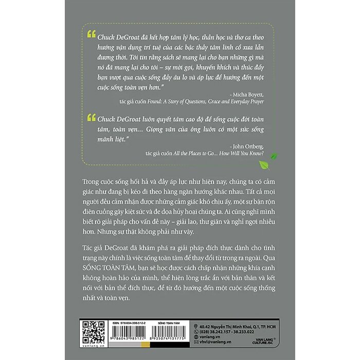 "Chuck DeGroat luôn quyết tâm cao độ để sống cuộc đời toàn tâm, toàn vẹ Giọng văn của ông luôn có một sức sống mãnh liệt.” - John Ortberg, tác giả cuốn All the Places to G How Will You Know?
