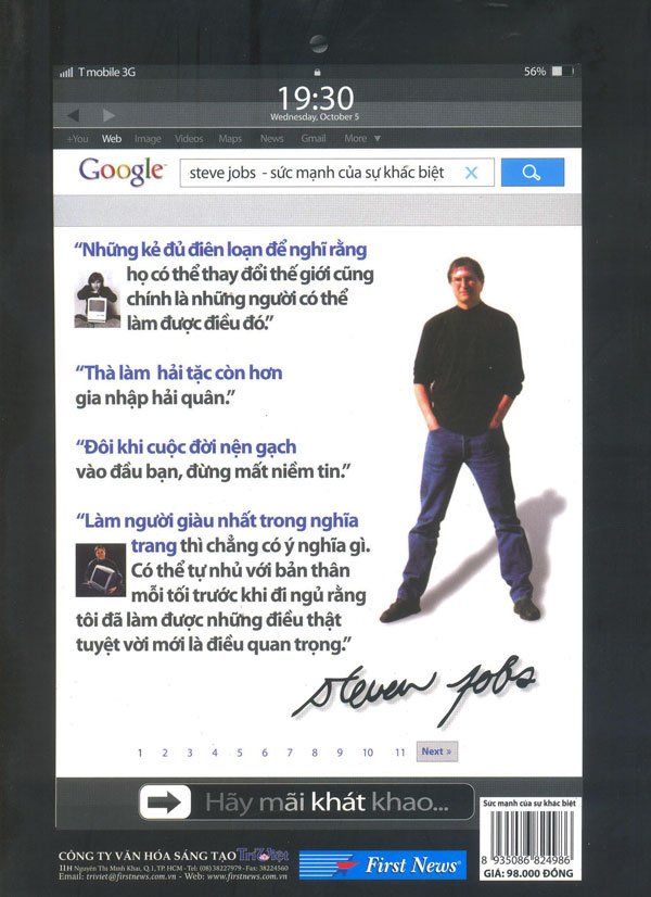 Bìa bốn của cuốn sách đặc biệt tưởng nhớ Steve Jobs được thiết kế sáng tạo và tràn đầy cảm hứng với người đọc, dưới dạng một trang tìm kiếm của Google search, có cụm từ khóa “Steve Jobs – Sức mạnh của sự khác biệt” và những trang kết quả. “Steve Jobs – Sức mạnh của sự khác biệt” sẽ không chỉ là cuốn sách đặc biệt tưởng nhớ người hùng vĩ đại của công nghệ thông tin mà còn là những góc nhìn, phân tích sắc nét về bí mật của những khác biệt tạo nên thành công của Steve, cùng nỗi đồng cảm với bạn đọc trong cuộc chiêm nghiệm sâu sắc những thông điệp cuộc sống. Cuốn sách này do GS-TS Huỳnh Ngọc Phiên làm chủ biên.