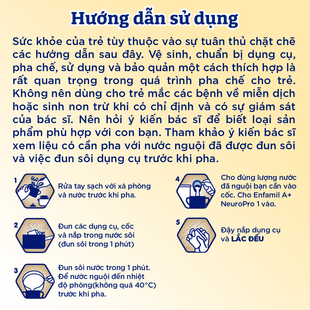 - Sữa bột Enfamil A+ NeuroPro 1 với 2’-FL HMO không đường sucrose cho vị thanh mát. THÀNH PHẦN Sữa bột Enfamil A+ NeuroPro 1 với 2’-FL HMO có thành phần gồm đường Lactose, hỗn hợp dầu thực vật (dầu cọ olein, dầu dừa, dầu đậu nành, dầu hoa hướng dương), sữa bột tách béo, hỗn hợp đạm whey tinh chất (sữa bò) – nguồn của MFGM, galactooligosaccharide, polydextrose, khoáng chất (kali clorid, natri citrat, tricanxi photphat, canxi carbonat, magiê photphat, kali hydroxit, kali citrat, sắt sulphat, kẽm sulphat, đồng sulphat, mangan sulphat, natri i-ốt, natri selenit), chất nhũ hóa (lecithin đậu nành), dầu đơn bào là nguồn chính của Axít Arachidonic (ARA) và Axít Docosahexaenoic (DHA), các vitamin (Axít ascorbic, choline clorid, alpha-tocopheryl acetat, vitamin A palmitat, niacinamide, phytonadione, canxi pantothenat, cholecalciferol, cyanocobalamin, riboflavin, thiamine hydroclorid, pyridoxine hydroclorid, Axít folic và biotin), sirô mật bắp, 2’-fucosyllactose, inositol, taurine, L-carnitine và chất chống oxy hóa (ascorbyl palmitat INS 304). Sản phẩm có chứa thành phần nguồn gốc từ sữa và đậu nành. ĐỐI TƯỢNG SỬ DỤNG Dành cho bé từ 0 - 6 tháng tuổi HƯỚNG DẪN CÁCH PHA Sức khỏe của trẻ tùy thuộc vào sự tuân thủ chặt chẽ các hướng dẫn sau đây. Vệ sinh, chuẩn bị dụng cụ, pha chế, sử dụng và bảo quản đúng cách rất quan trọng trong quá trình pha chế sữa cho trẻ. Sản phẩm không vô trùng và không nên dùng cho trẻ sinh non hoặc trẻ nhỏ có vấn đề về miễn dịch trừ khi có chỉ định và có sự giám sát của bác sĩ. Nên hỏi ý kiến bác sĩ để biết loại sản phẩm sữa bột phù hợp với con bạn.