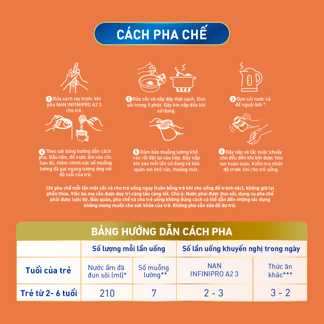 • Chỉ dùng muỗng lường trong hộp. Cho bột nhiều hơn hoạt ít hơn chỉ dẫn đều dẫn đến việc mất nước hoặc cung cấp không đủ dưỡng chất cho con bạn. Không được thay đổi tỷ lệ pha mà không có chỉ dẫn của cán bộ y tế. Chỉ pha chế mỗi lần một cốc và cho trẻ uống ngay (luôn bồng trẻ khi cho uống để tránh sặc), không giữ lại phần thừa. Việc bú mẹ cần được duy trì càng lâu càng tốt. Chú ý: nước phải được đun sôi, dụng cụ pha chế phải được luộc kĩ. Bảo quản, pha chế và cho trẻ uống không đúng cách có thể dẫn đến những tác dụng không mong muốn cho sức khỏe của trẻ. Không pha sẵn để dự trữ. Cách bảo quản: Nơi khô ráo thoáng mát, tránh ánh nắng trực tiếp. Sử dụng trong vòng 4 tuần sau khi mở hộp. Đậy kín nắp hộp sau mỗi lần sử dụng. Hạn sử dụng: 24 tháng Mô tả sản phẩm