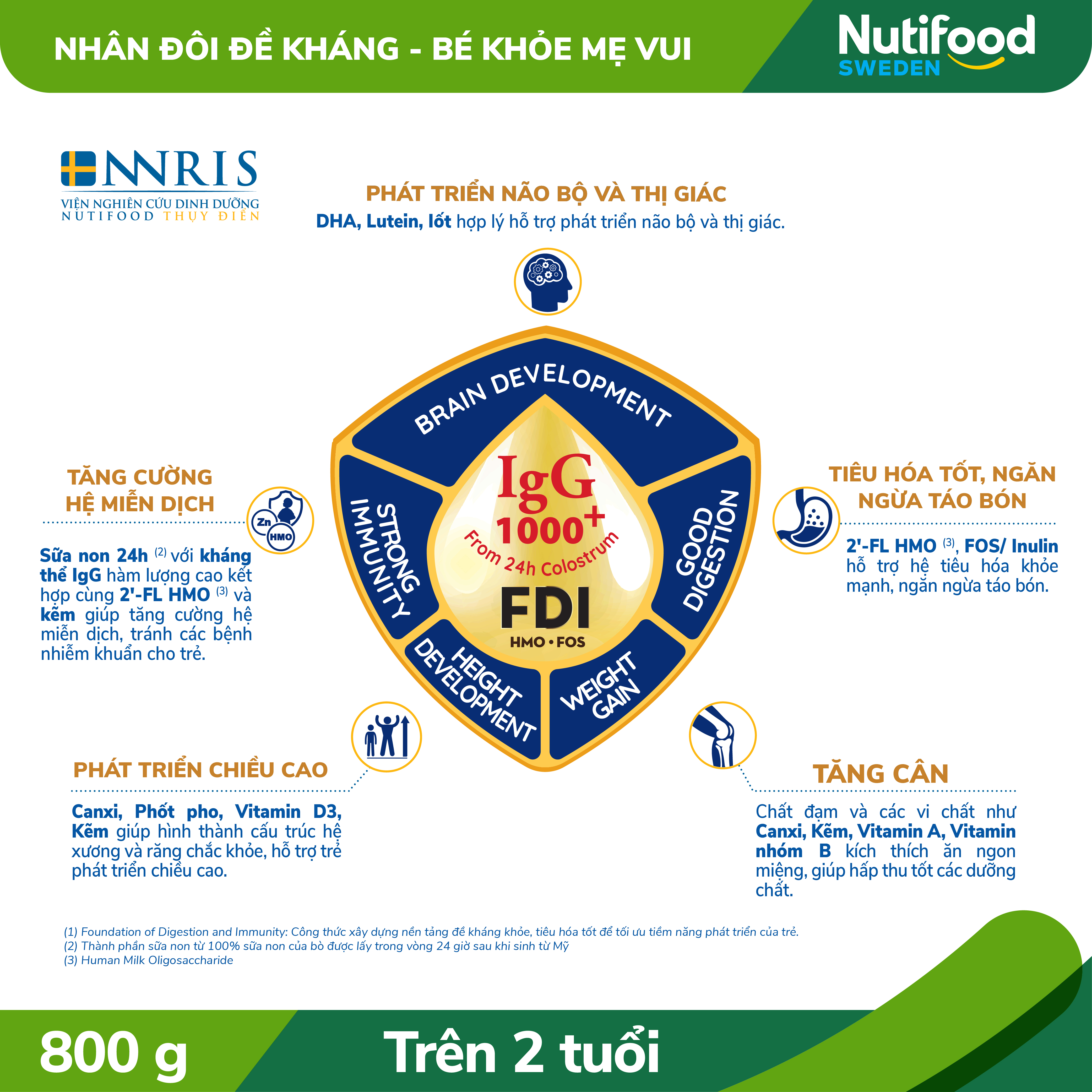 Nutifood Sweden GrowPLUS+ Sữa non là thương hiệu của Nutifood Thụy Điển với công thức được phát triển bởi Viện nghiên cứu dinh dưỡng Nutifood Thụy Điển (NNRIS), xây dựng nền tảng FDI hỗ trợ Đề kháng khỏe, tiêu hóa tốt, giúp chuyển hóa tốt các dưỡng chất. Nay bổ sung 100% Sữa non 24h tự nhiên từ Mỹ với hàm lượng cao kháng thể IgG 1000 mg cùng 2'-FL HMO giúp tăng cường đề kháng, cho bé phát triển khỏe mạnh.. Sản phẩm được sản xuất tại Singapore dưới sự giám sát và tiêu chuẩn chất lượng cao nghiêm ngặt của Nutifood Thụy Điển.