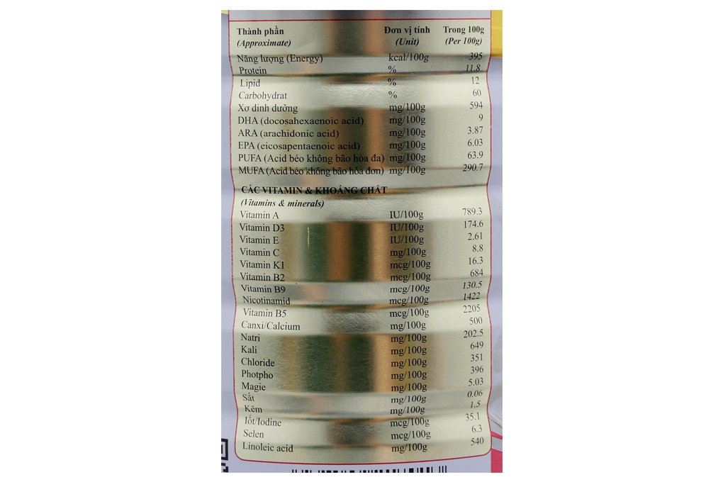 1. Thành phần: Sữa bột, Whey protein, Soy protein, Maltodextrin, Sữa non, L-Lysine HCL, FOS, Canxi Nano, Taurine, Choline, DHA, ARA, Vitamin (Vitamin A, Vitamin C, Vitamin D, Vitamin E, Vitamin D3, Vitamin K2,