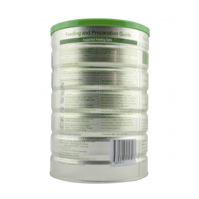 Sữa tách béo, lactose, dầu thực vật, whey protein cô đặc, galacto-oligosaccharides (GOS), lecithin (đậu nành), arachidonic acid (AA), docosahexaenoic acid (DHA), nucleotides (5’cytidine monophosphate, muối 5’uridine monophosphate disodium, 5’adenosine monophosphate, muối 5’inosine monophosphate disodium, muối 5’guanosine monophosphate disodium), lutein.