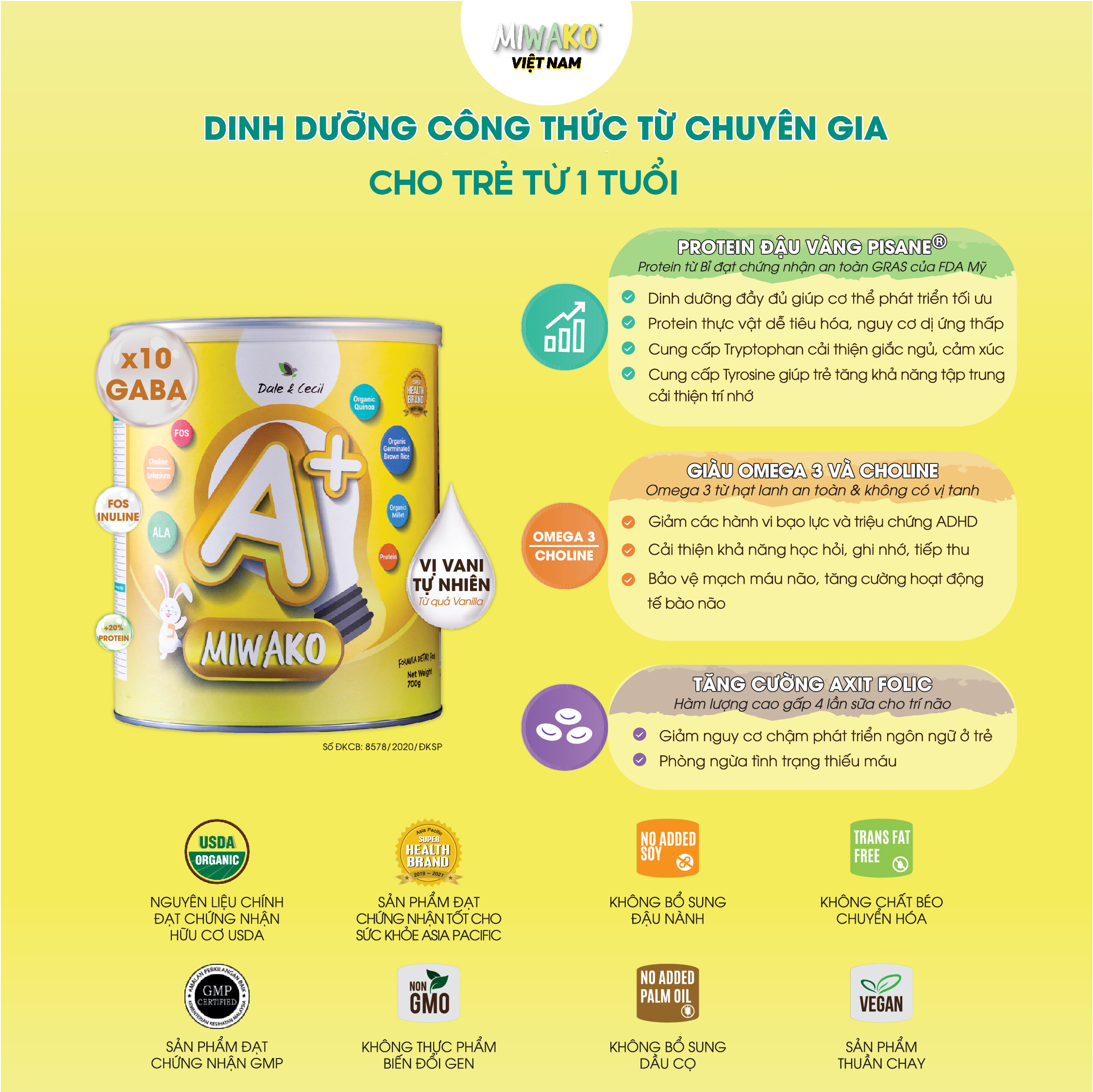 - Miwako A+ vị vani nhiều dinh dưỡng hơn dành cho các bé tăng động giảm chú ý