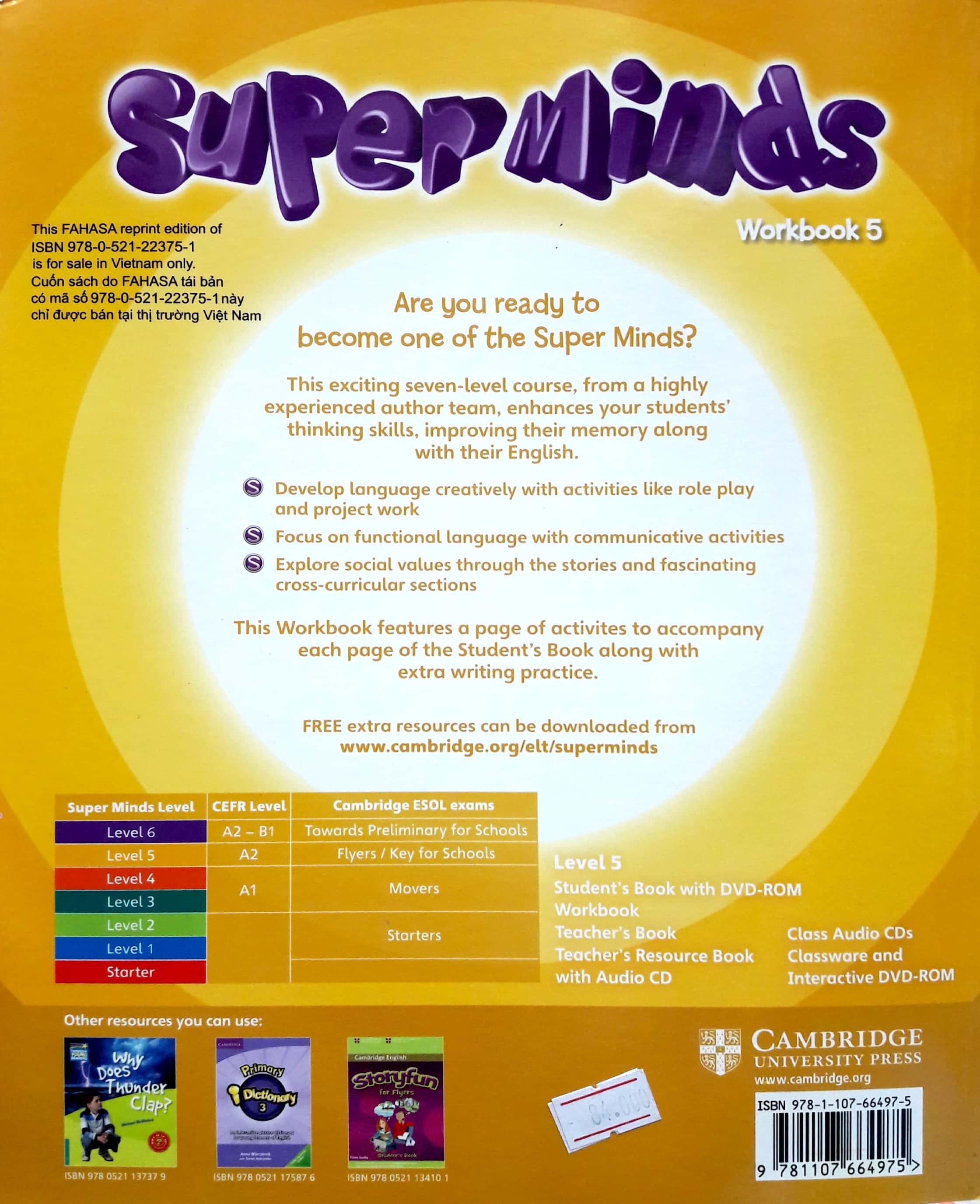 Mua tại TiktokSuper Minds American English is a seven-level course for young learners. Written by a highly experienced author team, Super Minds enhances your students' thinking skills, improving their memory along with their language skills. This Level 5 Workbook includes activities to develop language creatively, fascinating cross-curricular sections, and lively stories that explore social values. For each Student's Book page, this Workbook features a page of activities. Class Audio CDs, including audio from the Student's Book and Workbook, are sold separately .