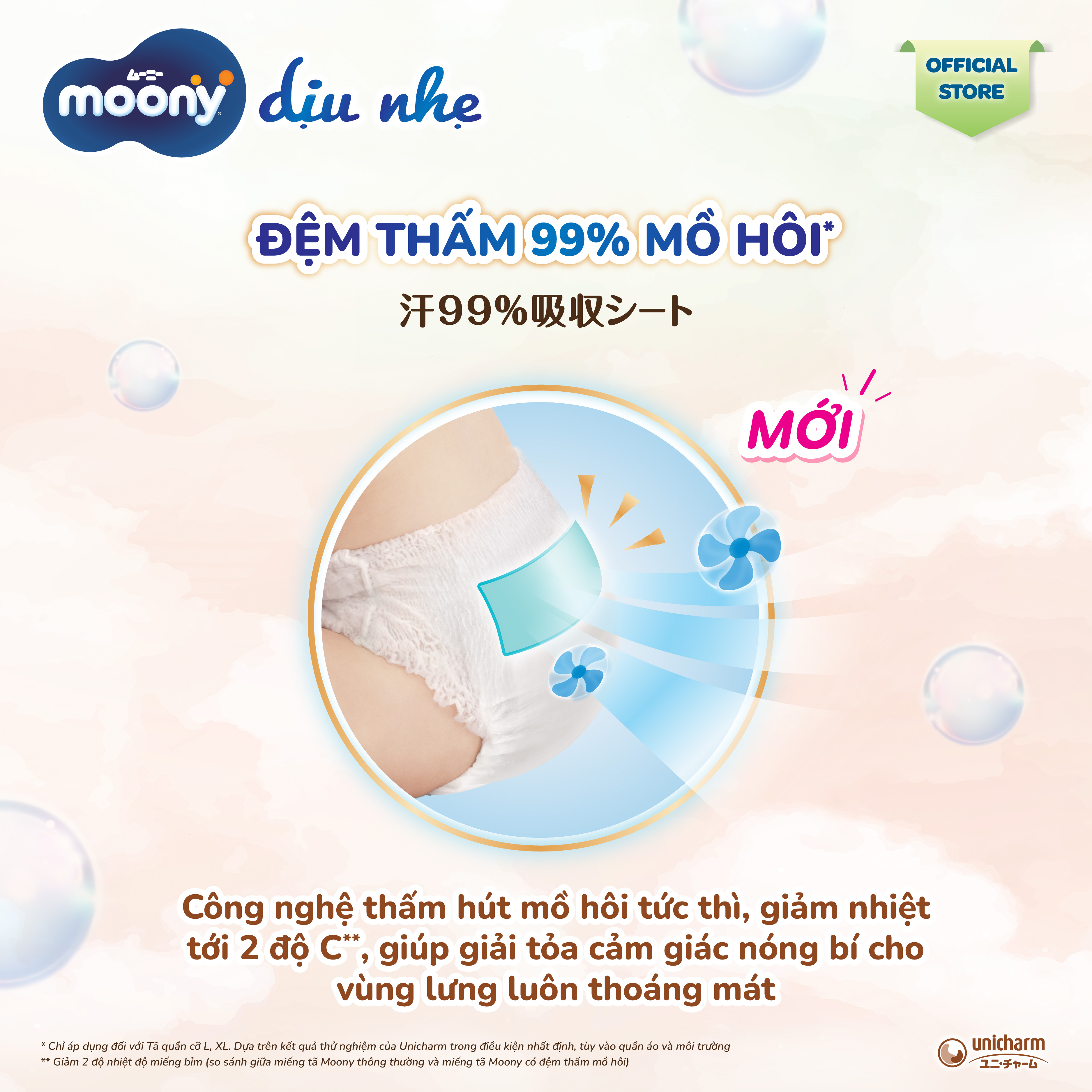 - Tã Quần Moony Dịu Nhẹ với bộ đôi tính năng cải tiến hoàn toàn mới, giúp nuôi dưỡng và chăm sóc toàn diện làn da bé yêu: