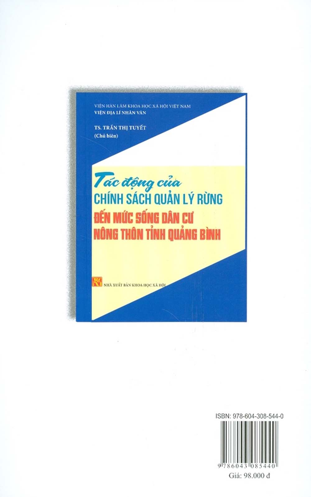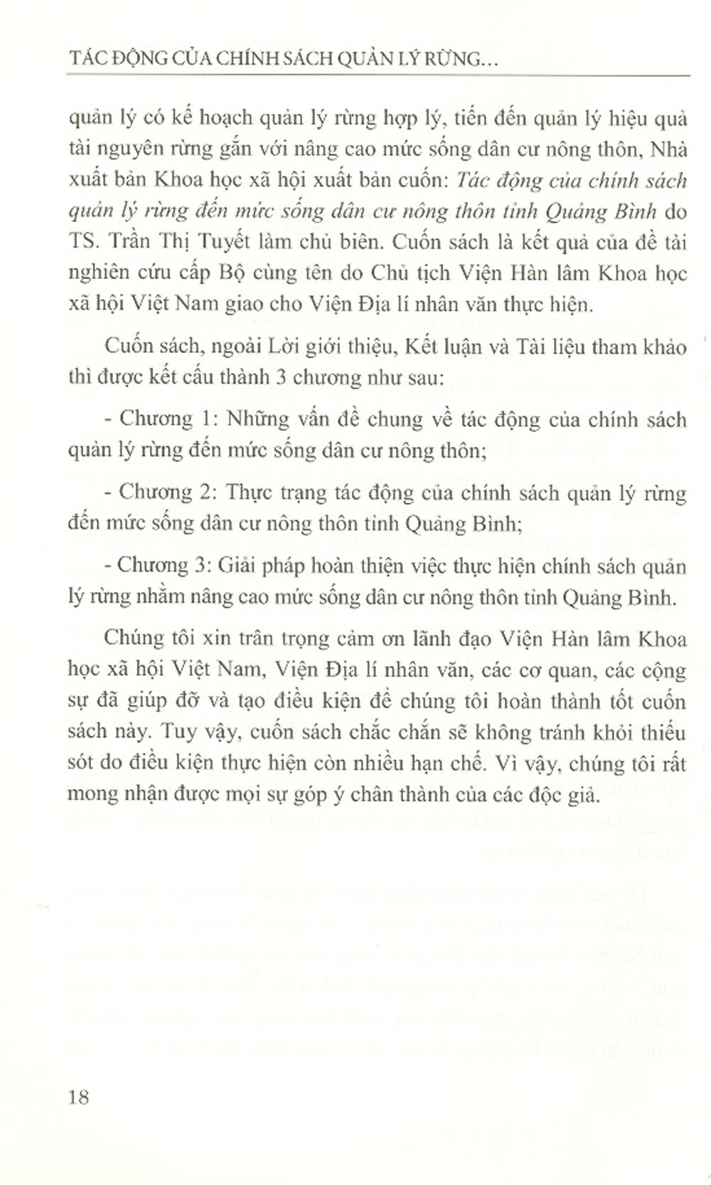 Để góp phần có cái nhìn tổng quan về quản lý rừng ở Việt Nam, phân tích tính hữu hiệu của chính sách quản lý rừng liên quan và ảnh hưởng như thế nào đến mức sống dân cư, nhất là sinh kế người dân ở vùng lâm nghiệp trong quá trình triển khai đề án tái cơ cấu ngành, hướng đến mục tiêu phát triển bền vững lâm nghiệp; qua đó, cung cấp cơ sở khoa học để các nhà hoạch định chính sách, các nhà quản lý có kế hoạch quản lý rừng hợp lý, tiến đến quản lý hiệu quả tài nguyên rừng gắn với nâng cao mức sống dân cư nông thôn, Nhà xuất bản Khoa học xã hội xuất bản cuốn: Tác động của chính sách quản lý rừng đến mức sống dân cư nông thôn tỉnh Quảng Bình do TS. Trần Thị Tuyết làm chủ biên. Cuốn sách là kết quả của đề tài nghiên cứu cấp Bộ cùng tên do Chủ tịch Viện Hàn lâm Khoa học xã hội Việt Nam giao cho Viện Địa lí nhân văn thực hiện.