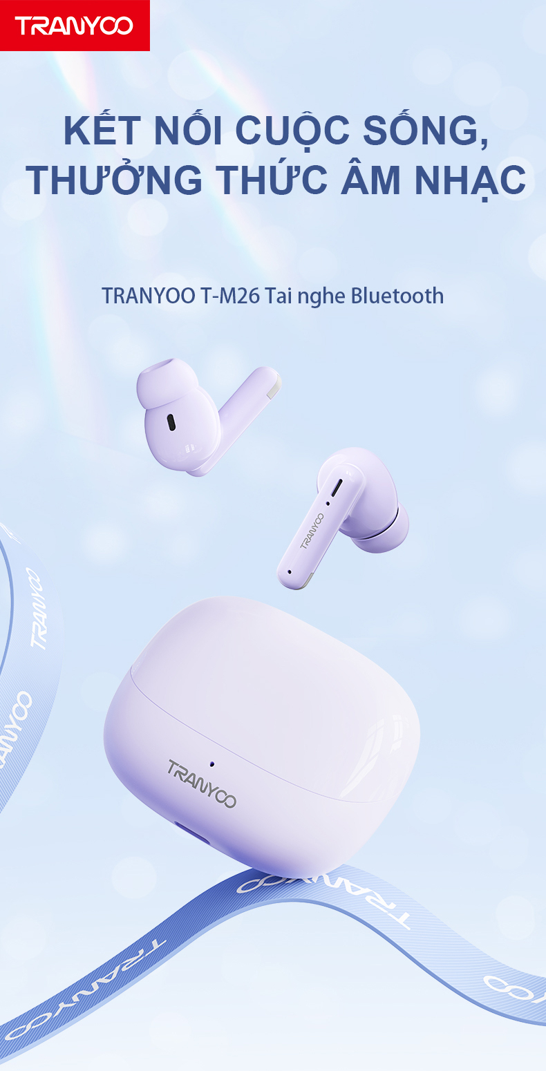 Tai nghe Bluetooth 5.3 TRANYOO T-M26, khử tiếng ồn thông minh, thiết kế đẹp, sang trọng, pin trâu -Tên sản phẩm: Tai nghe Bluetooth Tranyoo - Model: T-M26 - Chip Bluetooth: JL7023 -