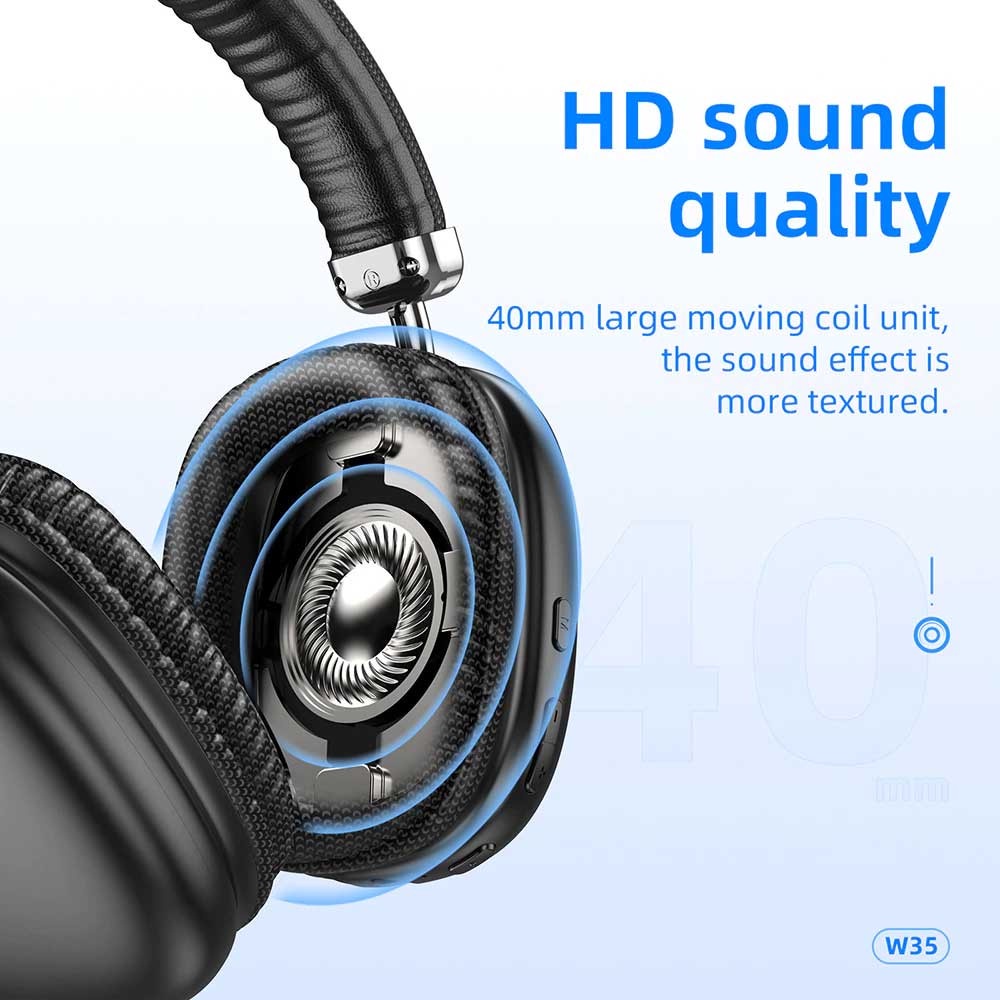 Tai Nghe Bluetooth Cao Cấp Chụp Tai W35, Chống Ồn, Chống Thấm Nước, Pin Siêu Trâu 40h Nghe Nhạc, Kiểu Dáng Sang Trọng. Thông tin sản phẩm : Bluetooth 5.3, Chip: JLAC7006 Hỗ trợ thẻ