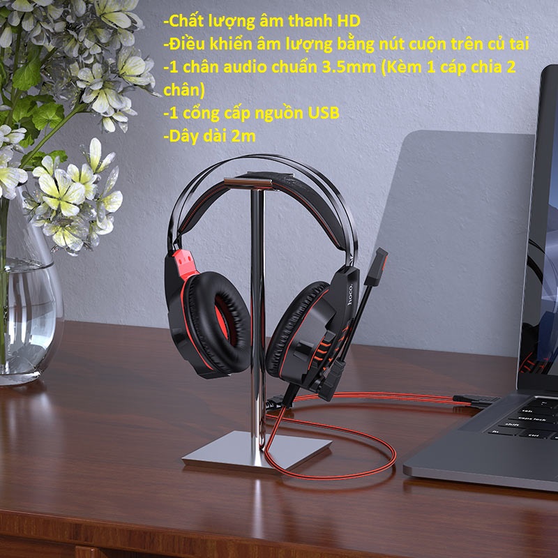 Tai nghe gaming có đèn LED thương hiệu hoco, model: W102 -Chất lượng âm thanh HD -Micro hạn chế tiếng ồn, xoay 90 độ -Điều khiển âm lượng bằng nút cuôn trên củ tai. -Hiệu