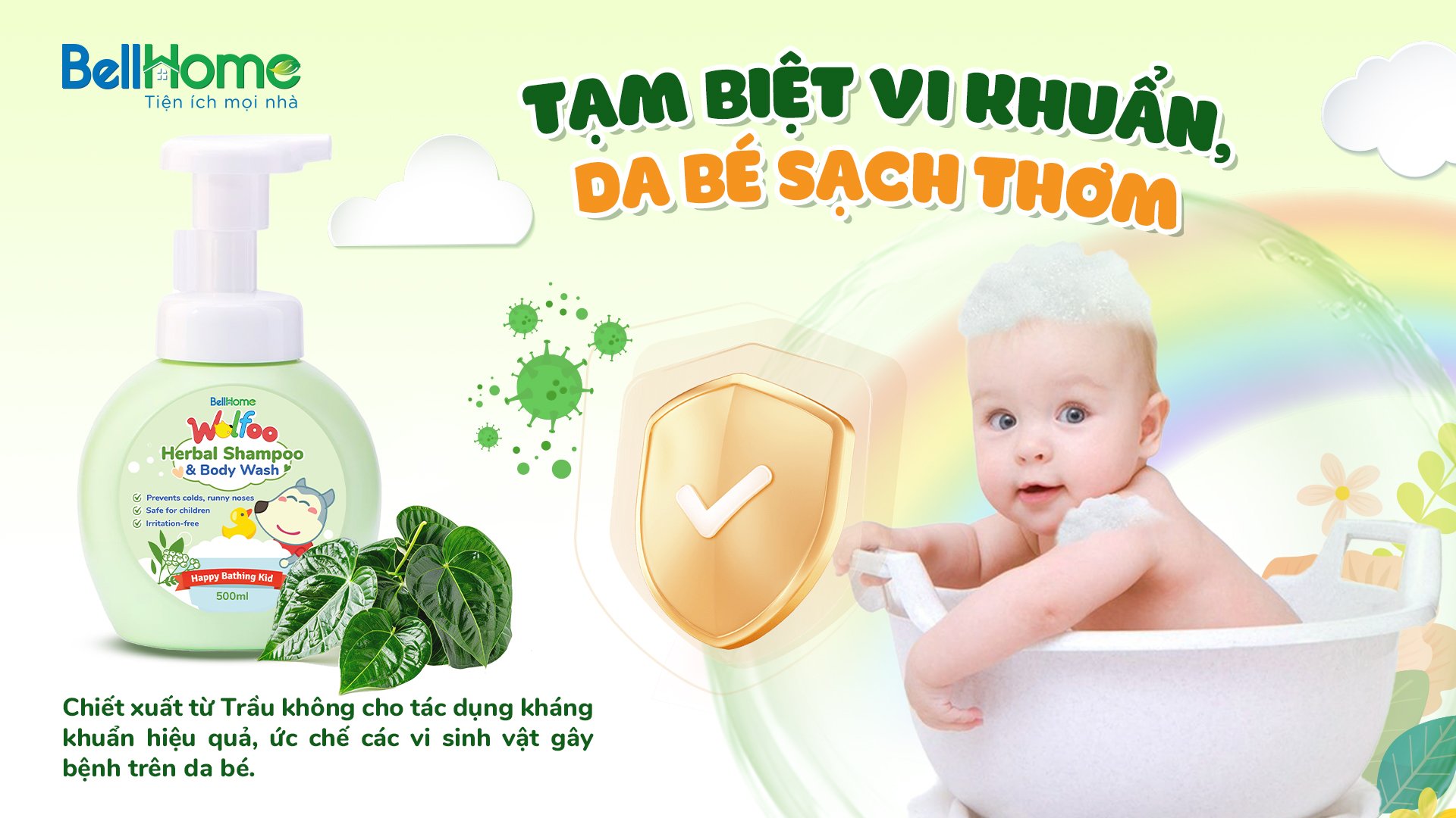 - Dùng đủ kháng sinh, hạ sốt mà vẫn không đỡ, chưa kể tác dụng phụ. Thấu hiểu nỗi lòng của mẹ,Bell Home cho ra đời dòng sản phẩm Tắm Gội Thảo Dược Wolfoo Baby chống cảm chuyên biệt đồng hành cùng mẹ bảo vệ bé yêu Thành phần chính: