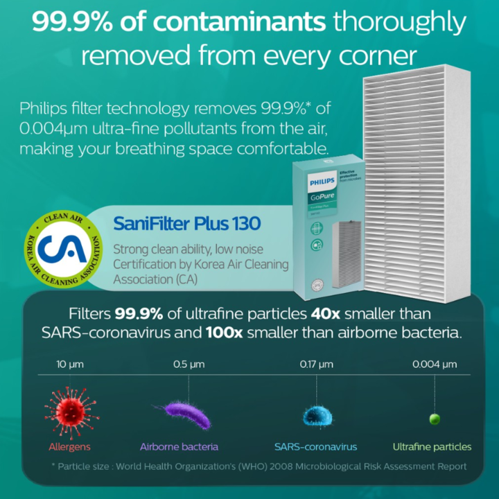 - oại bỏ 99,97% chất gây ô nhiễm trong không khí như vi rút, sol khí, khói và hơn thế nữa - Lọc không khí cho các phòng có diện tích lên đến 59 m²