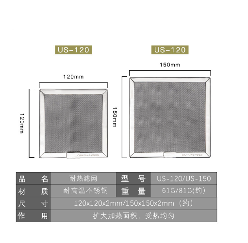 TẤM LƯỚI TỤ NHIỆT CAMPINGMOON US-120/US-150 * THÔNG TIN SẢN PHẨM - Thương hiệu: Campingmoon - Mã sản phẩm: US-120/US-150 - Chất liệu: Thép không gỉ - Kích thước & Trọng lượng: + US-120: Kích thước 120x120x2cm; Trọng lượng 60g + US-150: Kích thước 150x150x2cm; Trọng lượng 80g - Xuất xứ: Trung Quốc