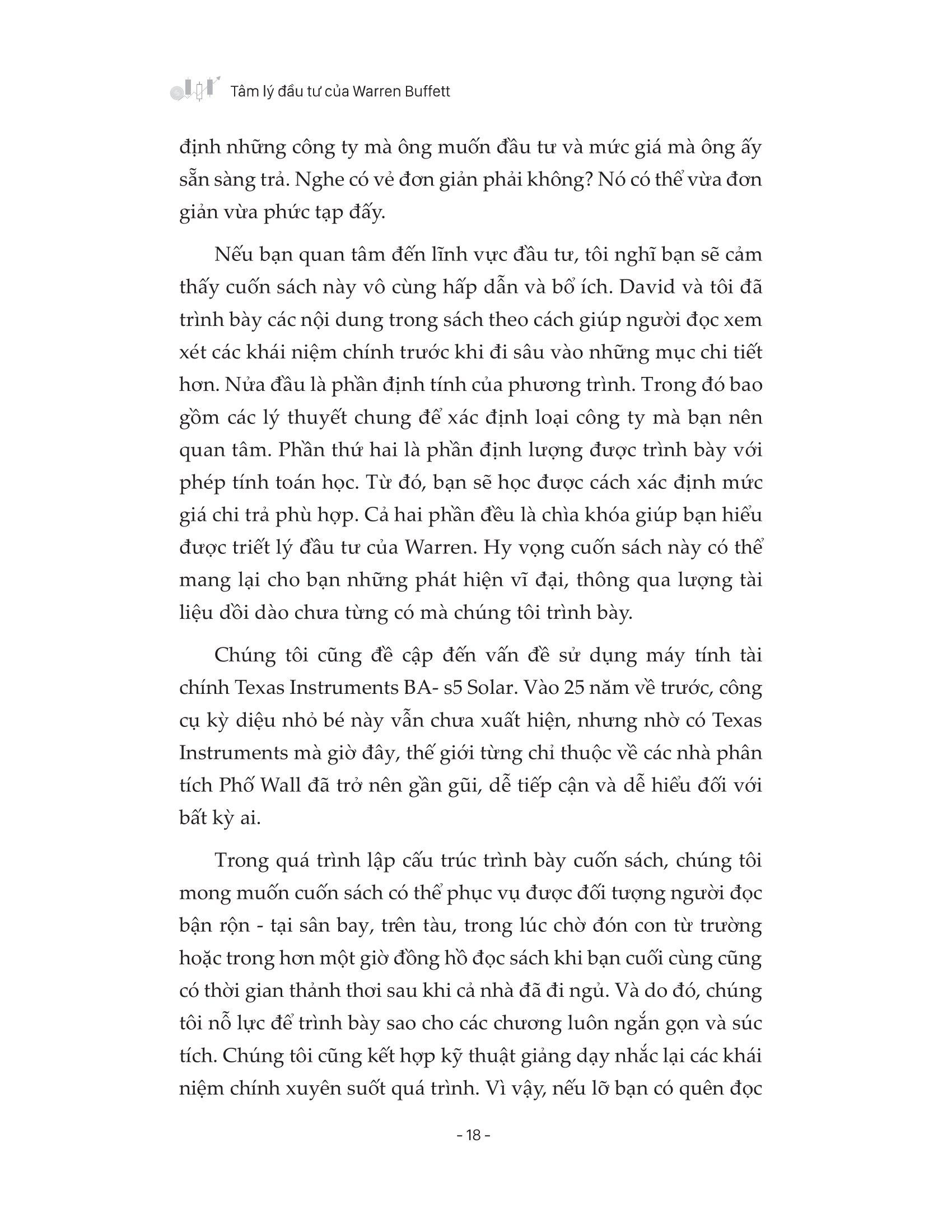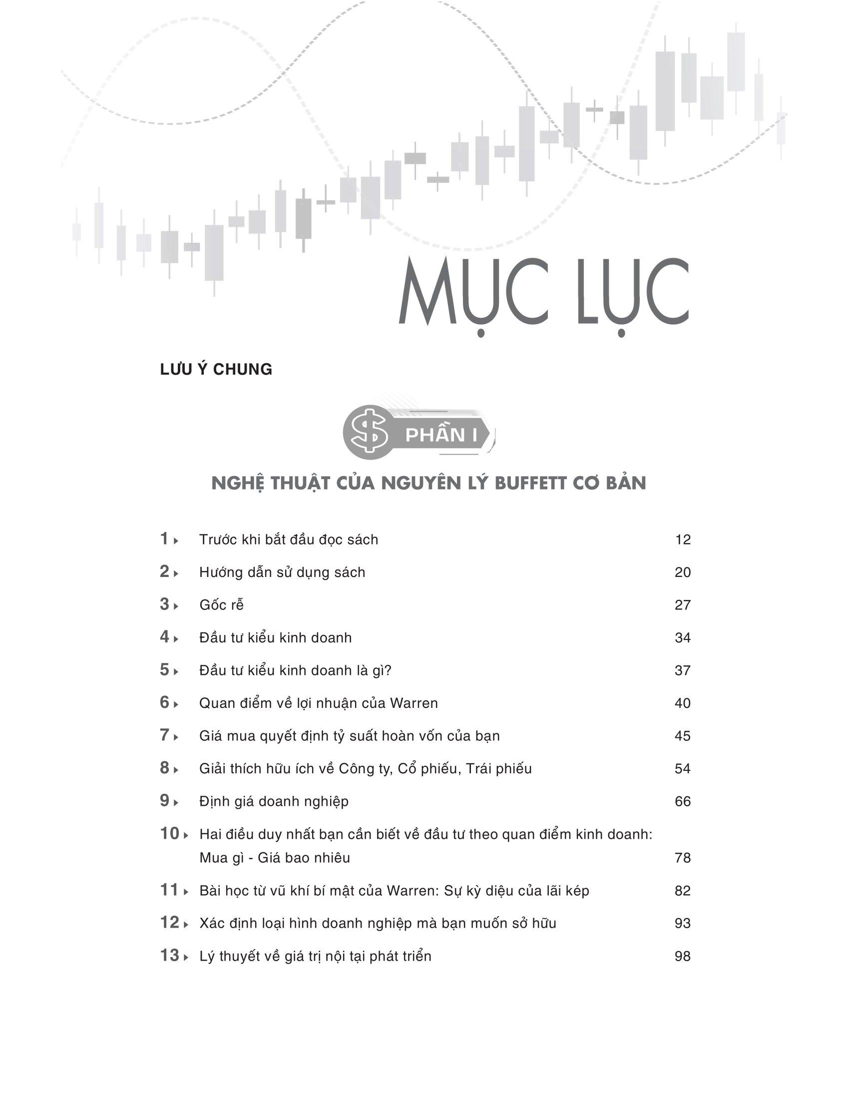 Cuốn sách nhằm đưa ra lời giải thích đầy đủ về cách Buffett đầu tư theo quan điểm kinh doanh vô cùng đặc biệt: không phải là "chọn cổ phiếu" mà là tìm kiếm và đầu tư vào các công ty xuất sắc có giá trị nội tại và thu nhập tiềm năng mà ông có thể dự đoán một cách hợp lý thông qua một loạt các bước mà chúng ta tìm hiểu trong suốt cuốn sách. Kèm theo đó là nhiều ví dụ điển hình hấp dẫn, cho chúng ta thấy Warren Buffett đang tìm kiếm những loại công ty nào và tại sao ông lại chọn lựa như vậy. Cuối cùng, tác giả cung cấp các phương trình toán học chi tiết mà Buffett đã sử dụng để xác định giá trị cơ bản và tiềm năng thu nhập của những lựa chọn của ông (và bạn đọc có thể sử dụng cách tính này một cách dễ dàng chỉ với một chiếc máy tính giá rẻ).