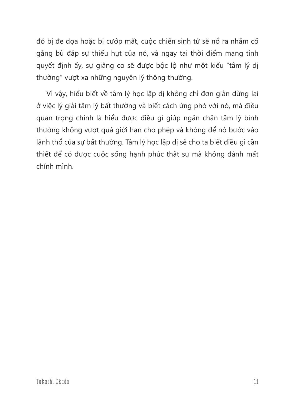 - Nhà văn Nhật Bản Natsume Soseki mắc chứng hoang tưởng bị hại. Vậy khi thiên thần và ác quỷ luôn cùng tồn tại, bạn phải làm sao để đối mặt với con quỷ bên trong con người m.ình? Câu trả lời sẽ được giải đáp trong “Tâm lý học lập dị”. Tựa sách đã chiếm vị trí hàng đầu trong bảng xếp hạng sách tâm lý học phổ thông của Amazon Nhật Bản suốt nhiều năm liền. Từ việc phân tích những thói quen kỳ quặc xuất hiện trong hành vi hằng ngày của con người, nội dung sách sẽ giúp chúng ta khám phá và hiểu về “một bản thân khác” ẩn sâu trong cơ thể, đồng thời tìm lại lối sống cân bằng để không đánh mất nền tảng tinh thần của chính m.ình. Chỉ khi bình tĩnh chấp nhận các trạng thái TÂM LÝ LẬP DỊ và điều chỉnh một cách có ý thức, bạn mới có thể tồn tại mạnh mẽ trong thời đại cạnh tranh khốc liệt này. Sức mạnh của chúng ta nằm ở việc nỗ lực chữa lành bản thân sau thương tổn, không ngại thể hiện nội lực và tình yêu ẩn giấu bên trong m.ình. VỀ TÁC GIẢ: Takashi Okada sinh năm 1960 tại tỉnh Kagawa. Ông là một bác sĩ tâm lý, tiến sĩ y khoa và cũng là một nhà văn. Ông bỏ học khoa triết học của Đại học Tokyo, chuyển qua học và tốt nghiệp ngành Y khoa ở Đại học Kyoto. Ông tham gia nghiên cứu tại khoa Sinh học thần kinh, khoa Khoa học Não bậc cao, khoa Tâm thần, khoa Sinh lý bệnh Não tại cùng một trường đại học. Là một bác sĩ lâm sàng, ông phải đối mặt với cuộc khủng hoảng tâm lý của con người hiện đại. Ông là tác giả của nhiều tựa sách như: “Rối loạn nhân cách ranh giới”, “Hội chứng Asperger”, “Trầm cảm và rối loạn tâm trạng”, “Tại sao con người không thể ngủ?”,…