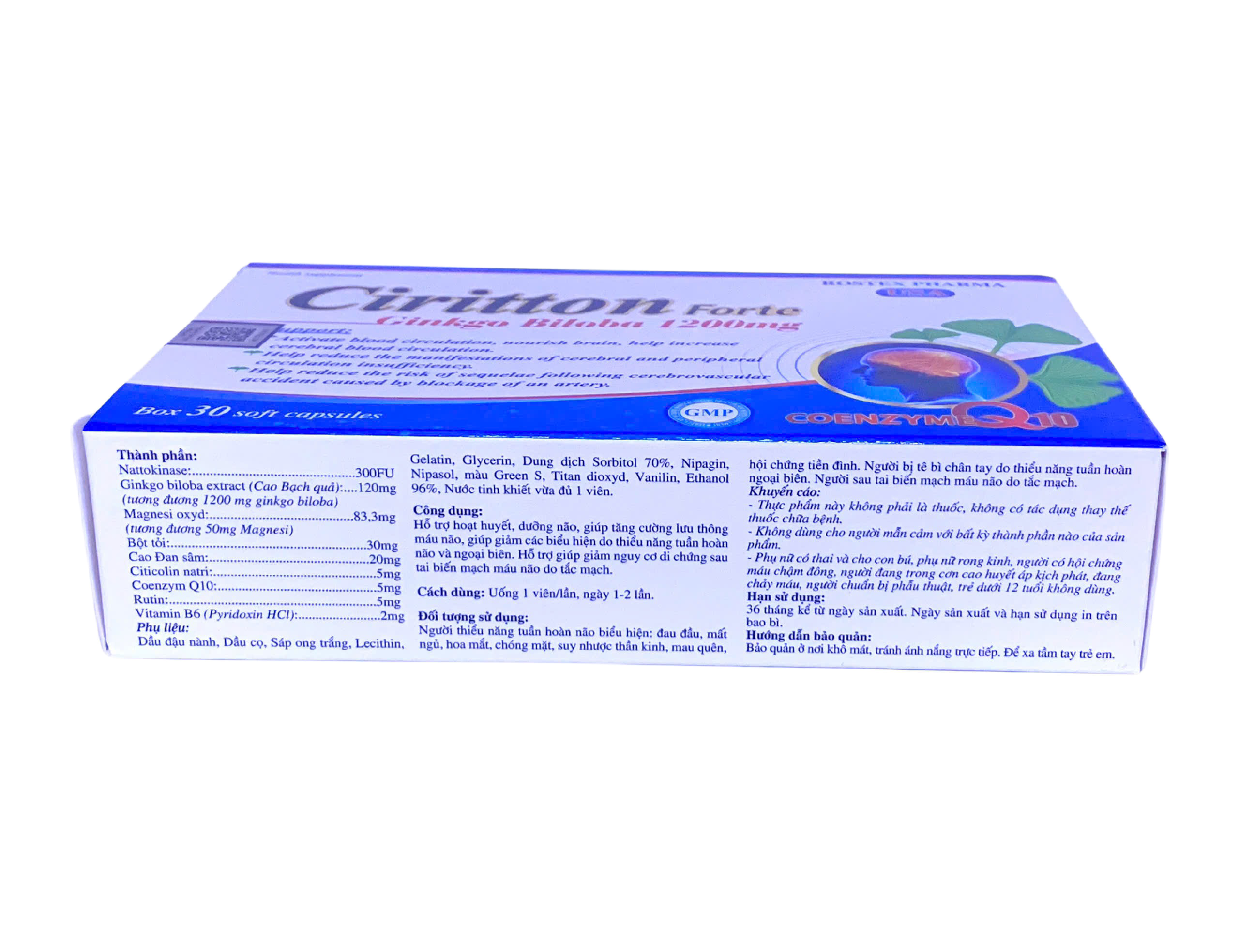 1. THÀNH PHẦN Nattokinase: 300FU Ginkgo biloba extract (tương đương 1200mg ginkgo biloba): 120mg Magnesi oxyd tương đương 30mg magnesi): 83,3mg Bột tỏi đen: 30mg Cao đan sâm: 20mg Citicolin natri: 5mg Coenzym Q10: 5mg