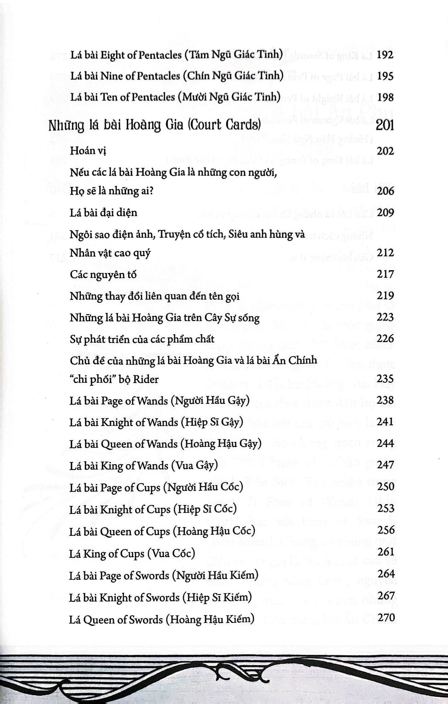 trúc giống nhau nhưng tính chất khác nhau. Mỗi nhóm đều gồm 10 lá bài được đánh số và 4 lá bài Hoàng Gia. Hãy để ý các trò chơi dùng đến bộ bài Tây. Ở hầu hết các trò này, lá bài thuộc loại nào không quan trọng – lá Bốn Chuồn về cơ bản giống như lá Bốn Bích. Tuy nhiên trong Tarot, lá Four of Wands (Bốn Gậy) khác với Four of Swords (Bốn Kiếm). Chúng có chung một điều mà ta gọi là “tính chất của số Bốn”, nhưng năng lượng nguyên tố chúng mang sẽ tạo nên những khác biệt. Còn các lá bài Ẩn Chính và Ẩn Phụ có sự phân biệt theo một chiều hướng khác. 22 lá bài chủ cho chúng ta thấy những chủ đề lớn như thiên nhiên, sự tự do, ánh sáng và bóng tối; trong khi 56 lá bài Ẩn Phụ thể hiện những khung cảnh và đặc điểm từ chính cuộc sống của chúng ta
