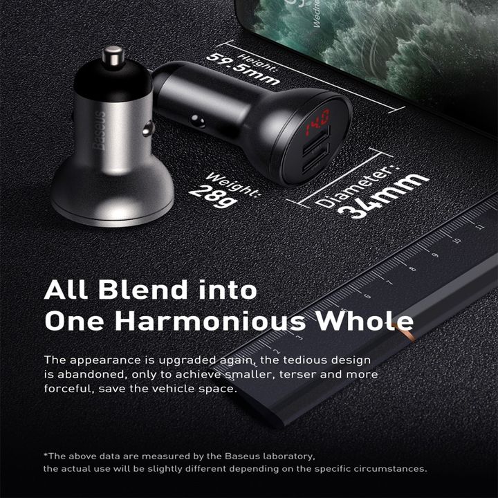 Thông số kỹ thuật Thương hiệu: Baseus Chất liệu: Hợp kim nhôm. + PC Đầu vào: DC 12V - 24V Bản 2U + 2C: USB output: 5V/3A; 9V/2A; 10V/2A; 12V/2.5A 30W Type C output: 5V/3A;