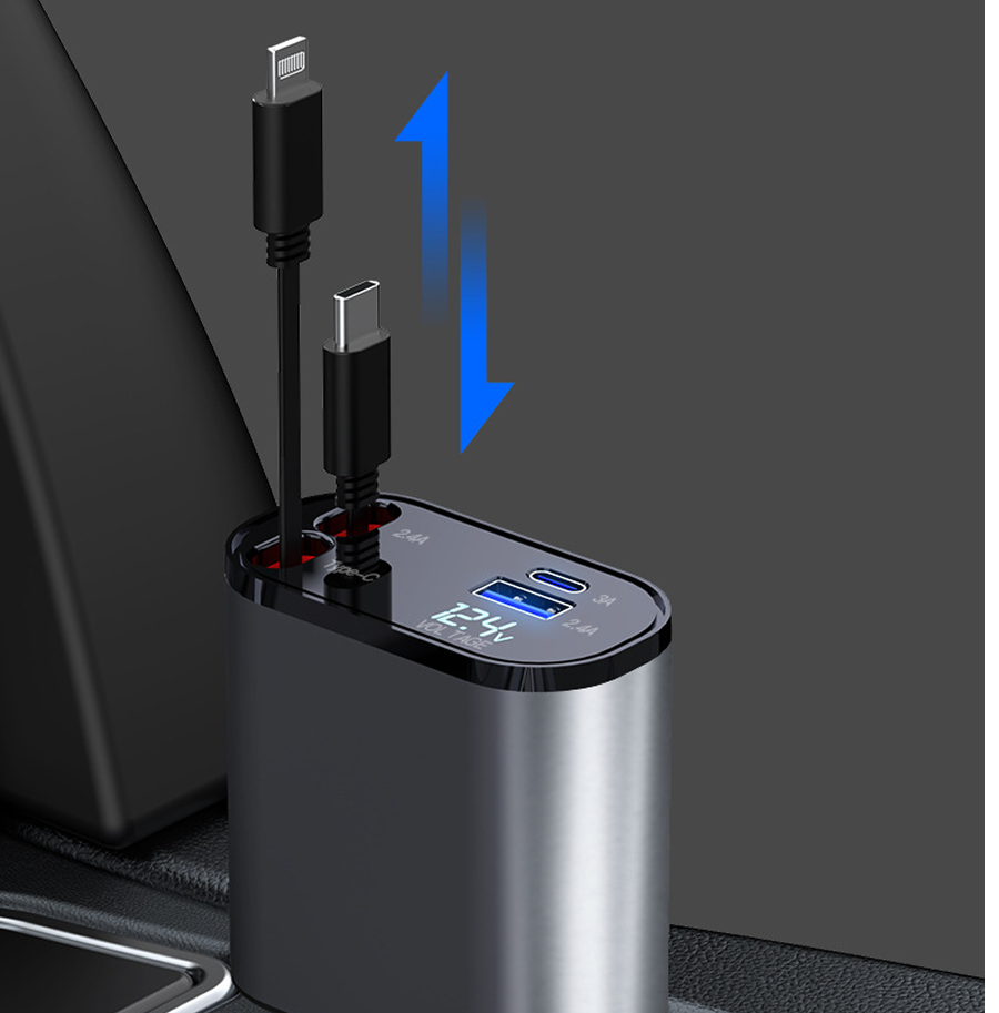Tẩu Sạc Nhanh Xe Ô Tô TÍCH HỢP DÂY Sạc Type C, Lightning 100W | Hiển Thị Thông Số Sạc, Dây Rút Chống Rối, 4in1 Thuận tiện: Bộ sạc ô tô USB này có thiết