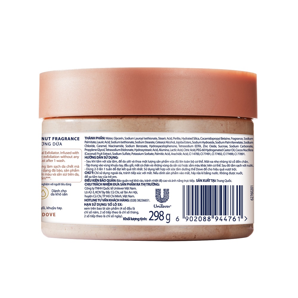 Mua tại TiktokTẩy Tế Bào Chết Dưỡng Ẩm Toàn Thân Dove Đường Nâu và Hương Dừa 298g Tẩy Tế Bào Chết Dưỡng Ẩm Toàn Thân Dove Đường Nâu và Hương Dừa 298g là sản phẩm tẩy tế bào chết toàn thân giúp làm mịn và nuôi dưỡng làn da khô và thô ráp mang lại làn da sáng tự nhiên. Với kết cấu đậm đặc, tẩy tế bào chết cơ thể Dove mang đến cho bạn lớp kem phủ mịn đẹp, tỏa ra mùi hương ngọt ngào khi bạn massage Thành phần chính và công dụng: