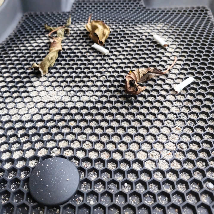 Lớp 2 – Thảm tổ ong giấu bụi bằng cao su PBR (Polybutadiene Rubber): Chất liệu cao su PBR dẻo dai, độ đàn hồi cao, chống mài mòn cực tốt, không mùi, thân thiện với môi trường và sức khỏe. Thiết kế tổ ong 3D thông minh giúp giấu bụi, giữ lại rác và đất cát mà không bị lộ ra ngoài. Khả năng bám sàn tốt, giúp thảm không bị xô lệch khi sử dụng. Có thể tháo rời dễ dàng để vệ sinh riêng, giữ cho lớp dưới luôn sạch sẽ.